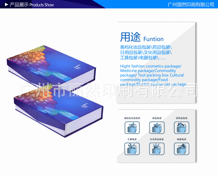广州市丽然印刷有限公司成立于2004年4月,注册资金500万元,总资产达4000万人民币。是一家专业从事化妆品、日用品、食品、电子类产品等包装盒的印刷生产企业。