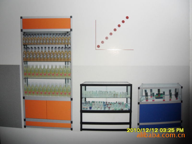 精品货架(铝钛合金货架):外观精美,结构牢,承重力强,拆装简便.具有良好的通透性,加上柔和的灯光、巧妙的设计和几十种橱柜的颜色,能展现您产品应有效果,提高商品价值。尺寸可根据您的需要制做。