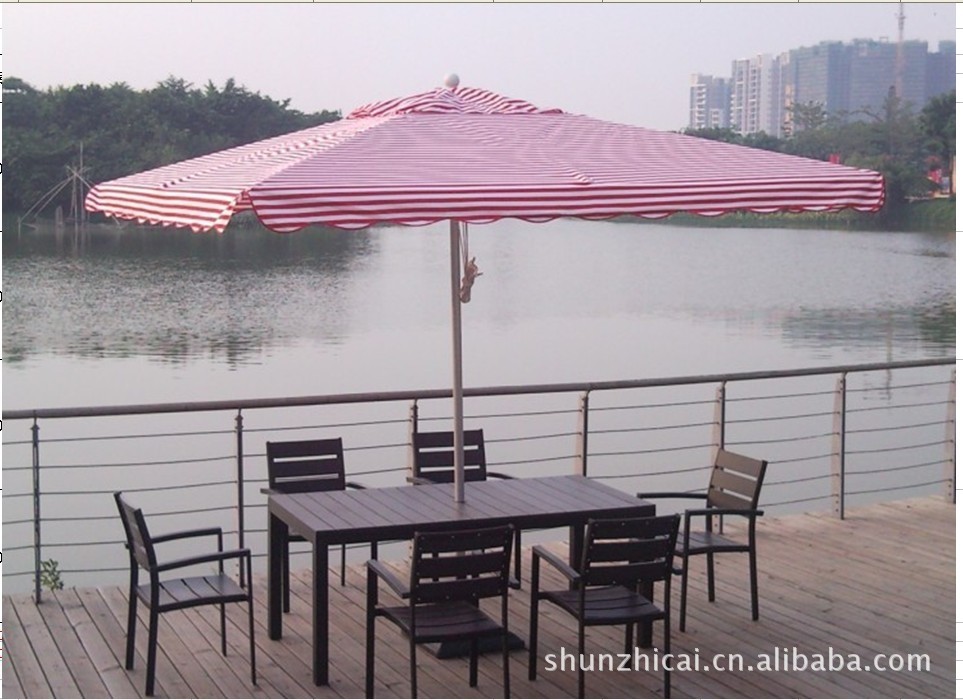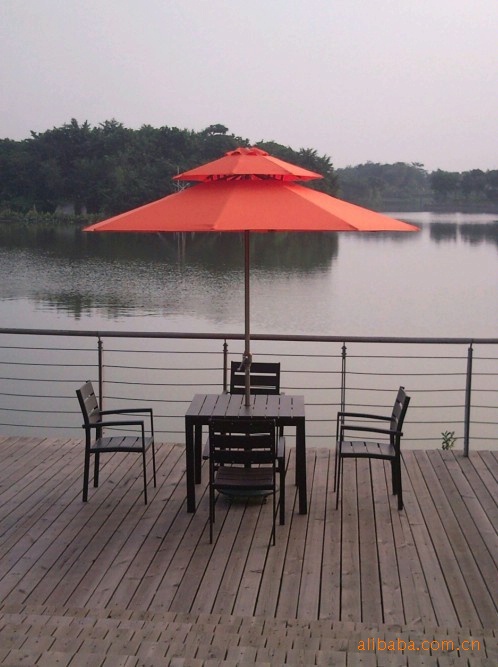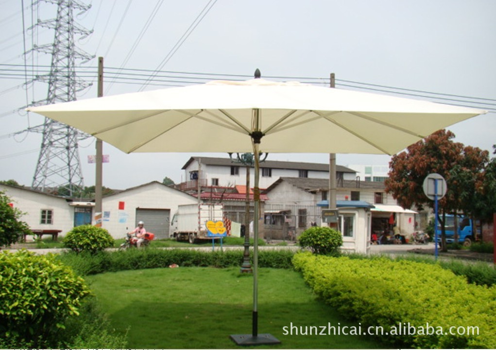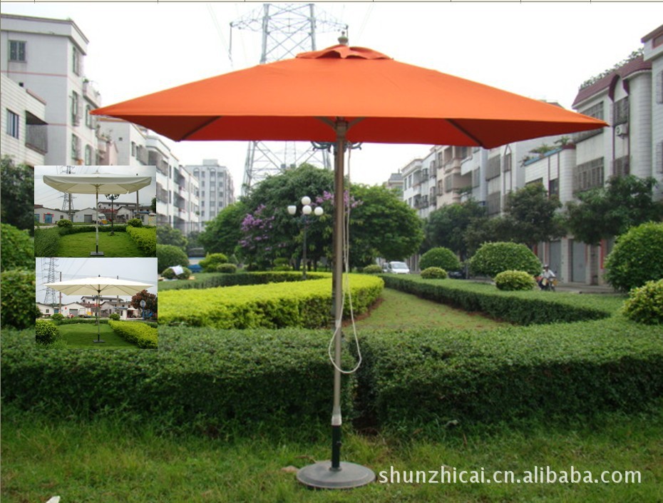 产品描述:全铝合金伞架,表面喷香槟色。中柱48MM,单柱,伞骨17*28MM,8骨。打开方式为双滑轮、双拉绳。配金属插销。配230克长纤布(可做垂边)。