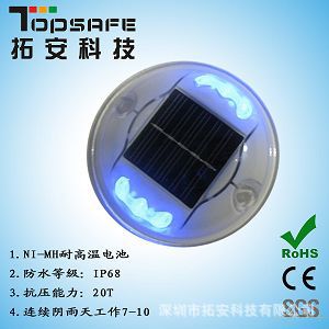 太阳能道钉是道路交通设施的一种新型主动发光警示产品,它以太阳能电池板为充电元器件,电池或电容为储能元器件,采用LED发光或结合反光片发光。主要设置于路边缘石,快慢车道分隔道上,一般同标线结合使用。 |