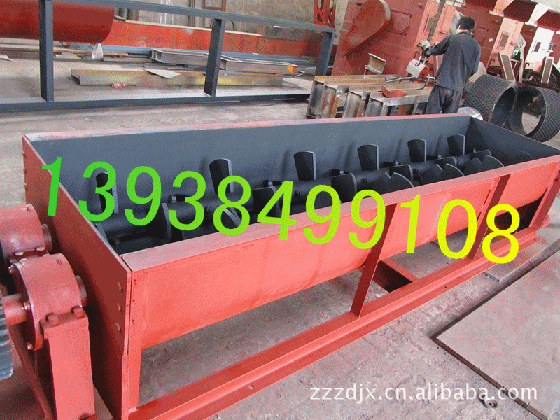 双轴搅拌机:它包括彼此平行的第一和第二搅拌轴、搅拌叶片和卧式搅拌桶,所述搅拌叶片从第一和第二搅拌轴向四周伸出,并在轴向依次等距排列而在圆周方向依顺时针或逆时针彼此相差一固定角度,使在第一和第二搅拌轴上的搅拌叶片分别形成旋向相反的螺旋状排列;所述第一和第二搅拌轴彼此同步转动并且其叶片交错通过由该第一和第二搅拌轴轴线所确定的平面;在所述搅拌桶一端的顶部设有进料口,而在所述搅拌桶另一端的底部设有出料。采用这种结构,搅拌机的搅拌叶片在搅拌干粉砂浆的同时将干粉砂浆从进料口排向进料口,从而实现生产的连续,有效的提高了生产效率。 |