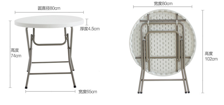 | 材质 | 桌面:HDPE高密度聚乙烯塑料 桌脚:25*1.0mm复合钢管, 表面喷塑 |