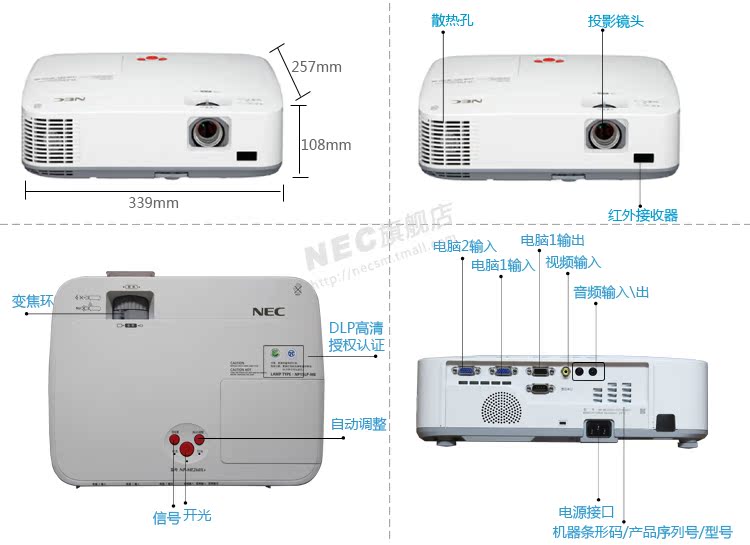NEC ME260X+投影机采用结实耐磨的防划外壳,通用的遥控器,标准的内嵌式镜头设计。ME260X+最大的变化就是红色的按键,远观效果较好,简洁实用,拥有电源开关、信号搜索和自动调节这三个按键。