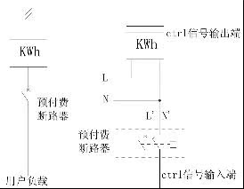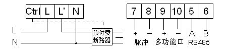 注:①接线时务必拧紧,避免因接触不良而引起电能表工作不正常;②电能表ctrl端子用于连接预付费表专用断路器的ctrl信号输入端,以完成对负载回路的控制。控制示意图如下: