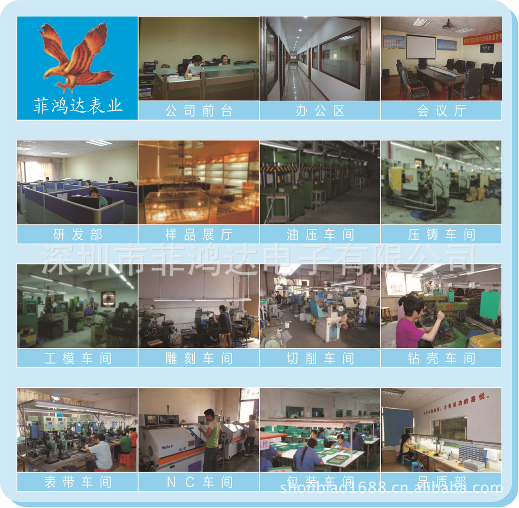 深圳市菲鸿达表业有限公司成立于1999年10月,总公司位于深圳市宝安43区翻身路彭氏工业大厦6楼。公司专业生产制造及销售锌合金、铜、不锈钢,及硅塑胶等材质的手表表壳、表带等配件及成品手表。产品种类众多,目前拥有自开模生产的款式上万款,成品类产品包括礼品手表,商务手表,运动手表,卡通手表,男女士礼品手表,情侣手表,石英手表,机械手表,电子手表,腕表,手链手饰表,手镯表,钟胆,怀表等。质量好,货期快而准时。欢迎广大客户来图,来办前来我司订单,欢迎随时来电咨询或莅临我司参观!我公司还提供为客户量身设计开发等服务,将全心全意的为客户打造满意可靠的产品。