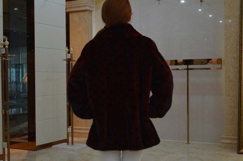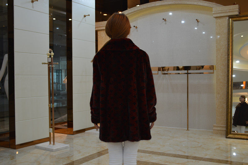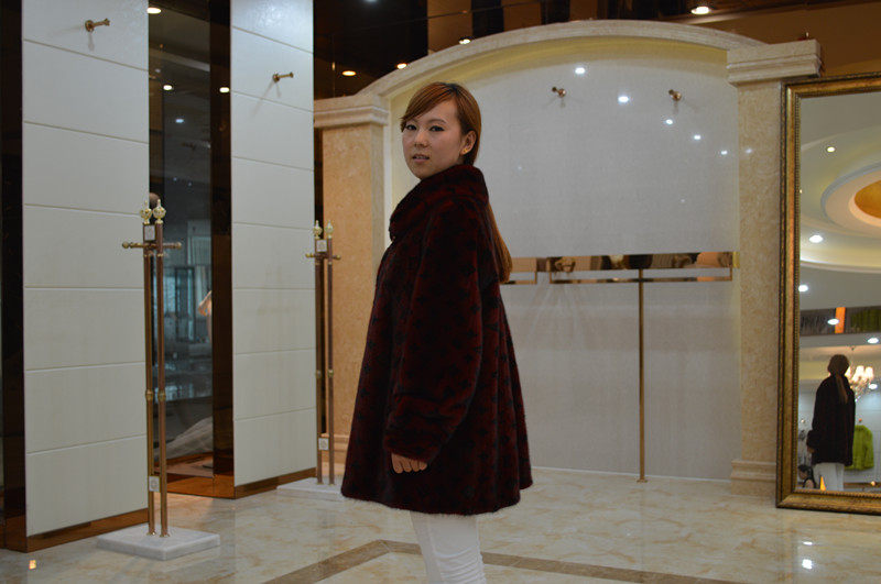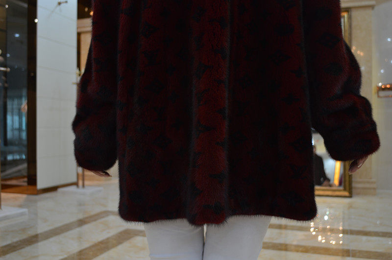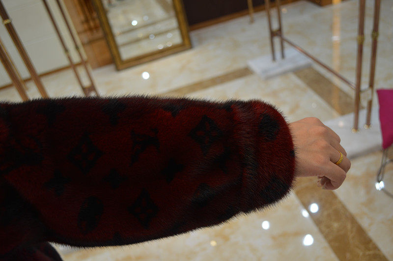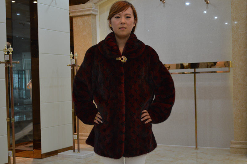 - 供应2013新款进口女水貂皮大衣整貂皮草外套酒红LV花纹香蕉领直摆