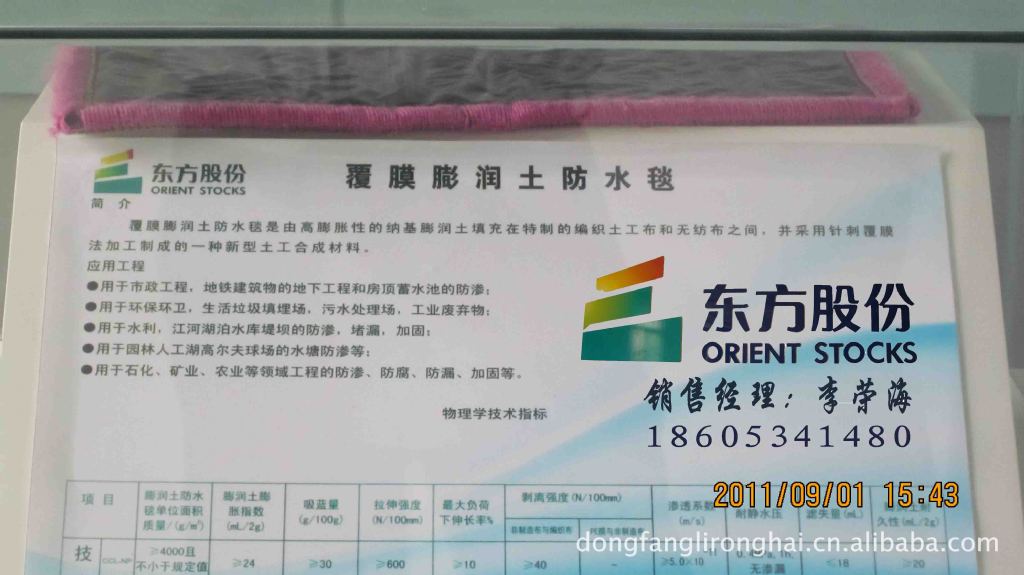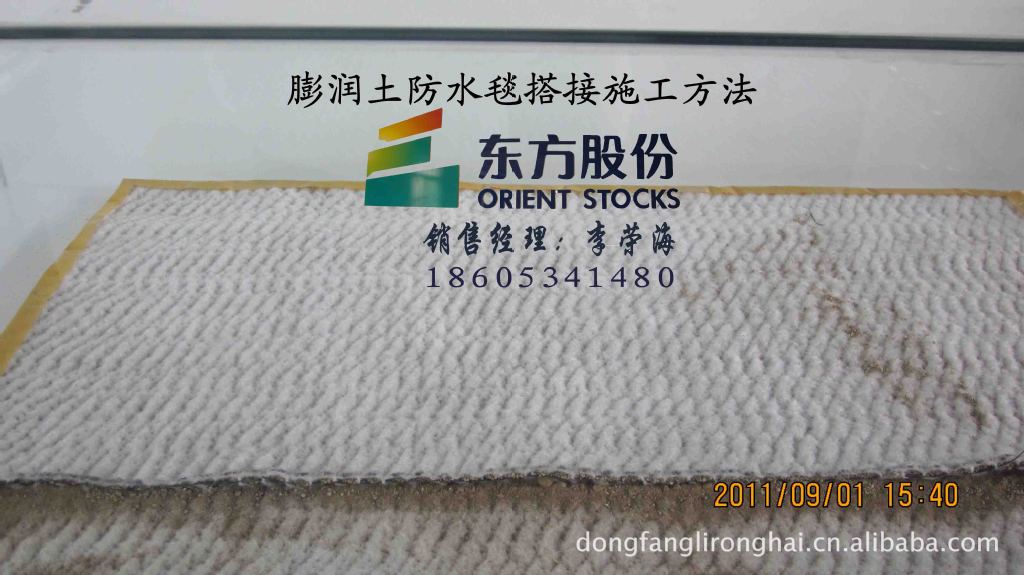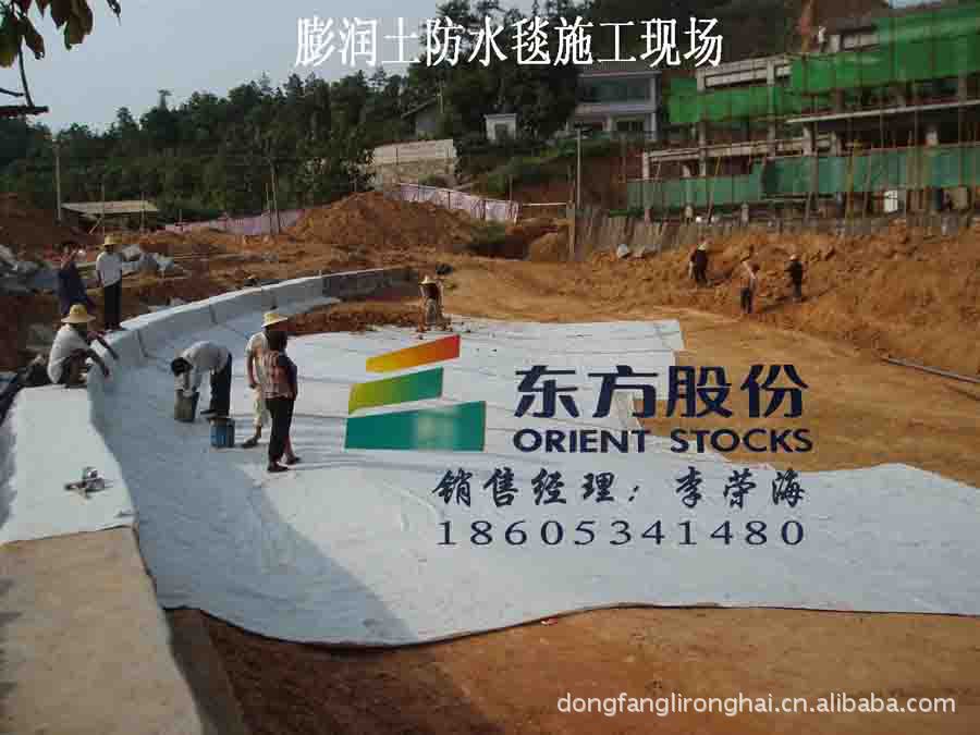 膨润土防水毯(膨润土防水垫) 是一种新型土工合成材料,广泛用于市政、公路、铁路、水利、环保、及工业与民用建筑中的地下防水防渗施工。膨润土防水毯是有一层粘土或其他低渗透性矿物材料外覆土工织物或土工膜,通过针刺或缝合的方法制成的复合防渗材料,我公司采用高膨胀性的钠基膨润土,特点是遇水后膨胀,产生水和作用,形成不透水的凝胶体,同时膨润土还有储存水分的能力,其吸收、含水量可以达到自身重量的10倍以上.