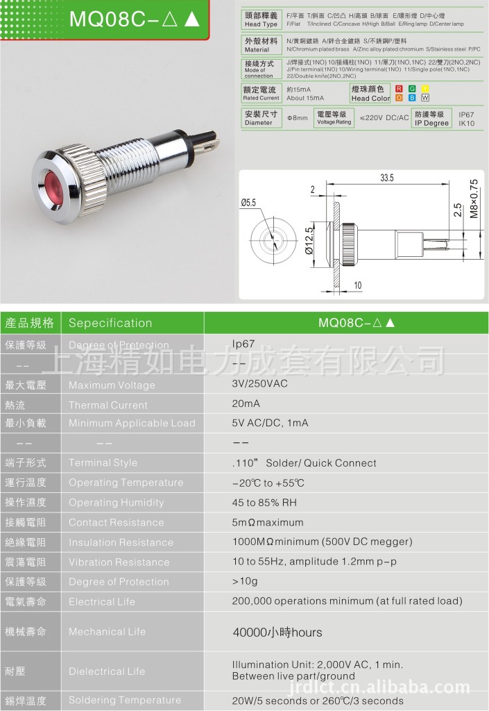 厂家直销8mm指示灯 焊接脚防水金属信号灯 电源指示灯 TUV CE认证