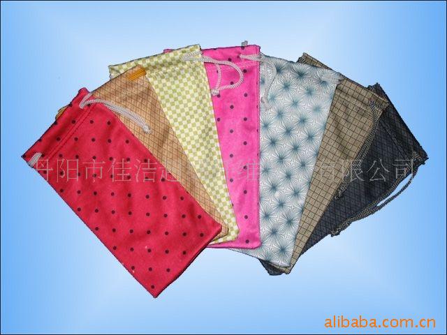丹阳佳洁超细纤维织品公司是超细纤维眼镜布、眼镜袋、洁净布的专业生产厂家,我公司生产的超细纤维布袋广泛适用于眼镜袋,手机袋,耳机袋,珠宝袋、MP4,此布袋既可用于袋装眼镜,手机,耳机,珠宝,也可用于以上产品的擦拭,一举两得。超细纤维眼镜布是一种新型的纳米布料,质地柔软,不伤所擦拭的物体表面,擦拭后物体表面不留任何痕迹,吸水性强,除尘效果特别好,符合环保要求,可反复洗涤使用. 超细纤维布由涤纶和锦纶组成,手感舒适,吸水性强,清洁功能强大,对物品表面无损伤,不掉毛,保护产品,颜色,规格,克重,包装等可以根据客人的要求定作。这种洁净布非常柔软,格调高雅,是宾馆、饭店、工厂、家庭、玻璃幕墙、汽车、电脑精密仪器、仪表、光碟、照相机镜头、眼镜等的理想洁净用品。