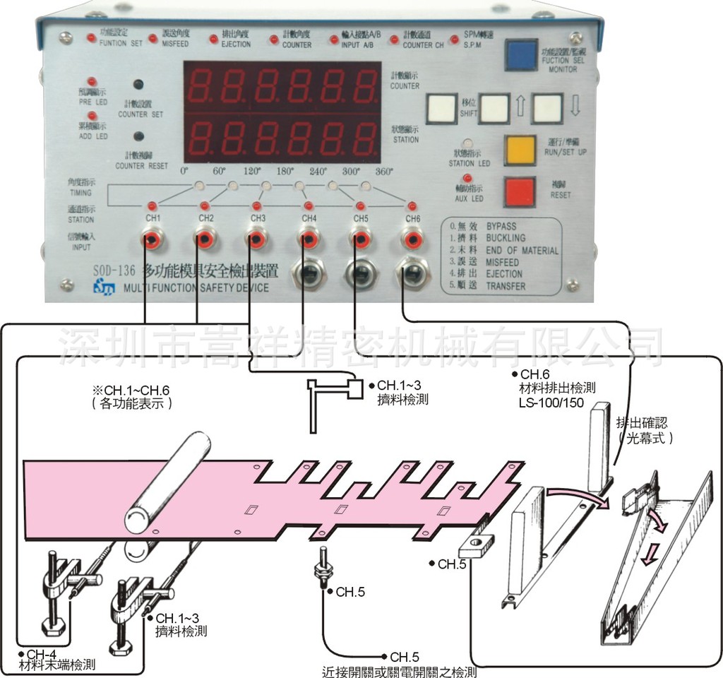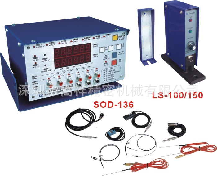 SOD-136多功能模具检出装置是冲床自动化不可缺少的模具误送检测装置,高技术,高性能,测试准确,应用范围广泛,一致受到工业界的好评,将优良丰富的功能,监测系统内藏于主机,操作简单,在冲床自动移送、冲压加工过程中,能快速准确监测模具误送,不良品之防备、材料末端检出,波动、挤料、误送、排出通过检出等等,优点特多,保护模具,至为重要的模具误送装置