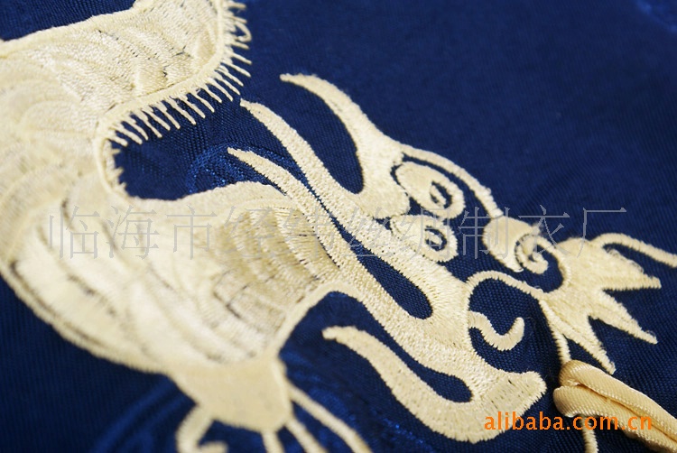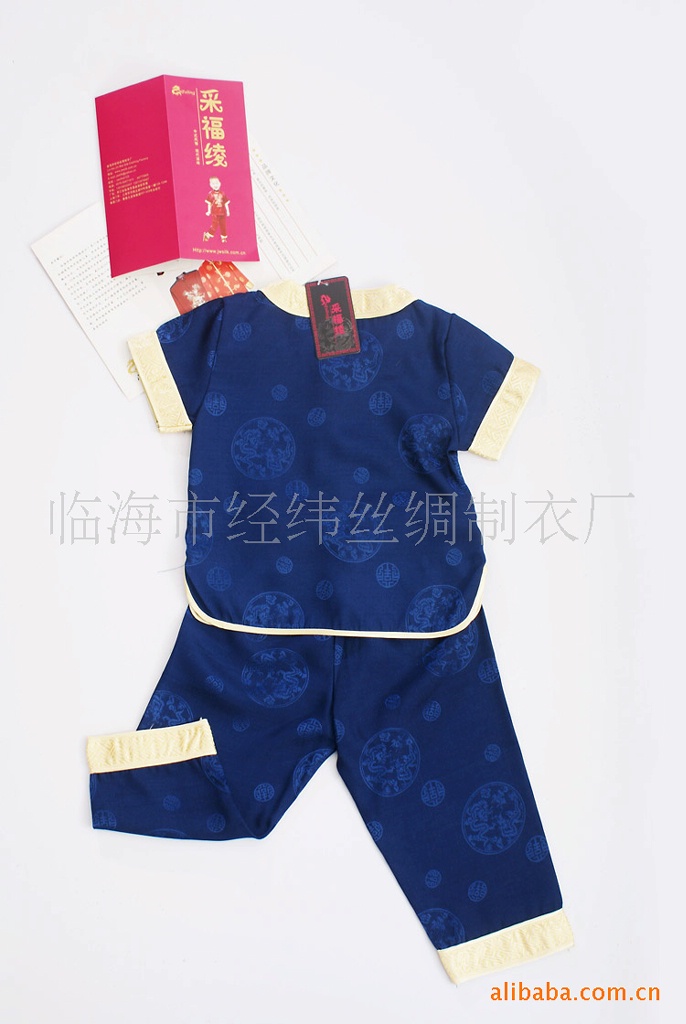 本款采用提花绸缎面料,简洁明快的一字手工盘扣,袖口、裤口、镶有金色宽边,上衣绣有中国特色的金色小双龙,象征望子成龙的含义。庆典、晚会等各种场合穿着,富贵华丽,传统时尚。做工精细,衣服为全夹,手感细腻,质感上层,特别适合小孩的皮肤。