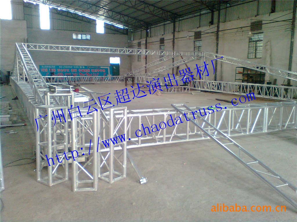 广州超达演出器材厂专业生产各种规格型号的铝合金桁架、展架、展示架,背景架、TRUSS,灯架,大型演出背景架,LAYER网架,手摇灯光架,音箱支架,单排灯架,三角桁灯架,四方灯架,圆型灯架,龙门架,活动舞台、透明舞台、折叠舞台, T型舞台,圆型舞台,升降型舞台,旋转型舞台,钢化玻璃舞台;有机玻璃舞台等演出器材,价格优惠,质量有保证。