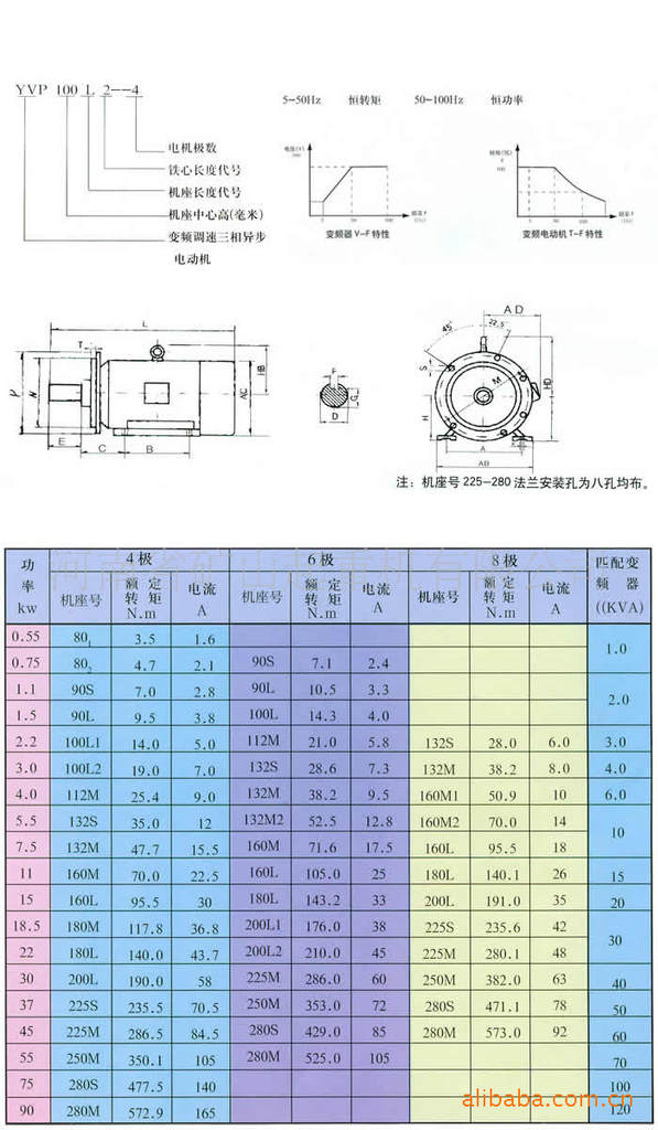 YVP系列电动机效率高、调速范围广、精度高、运行稳定、操作和维修方便,其安装尺寸符合国际电工委员会(IEC)标准。可以在5~100HZ范围内连续调速,5~50HZ为恒转矩运行50~100HZ为恒功率运行。