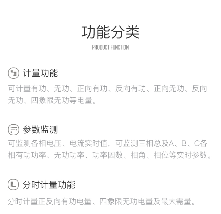 ① 计量参数:可计量有功、无功、正向有功、反向有功、正向无功、反向无功、四象限无功等电量。