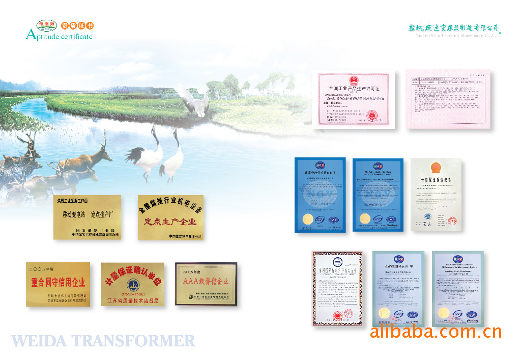 公司重点生产矿用隔爆干式变压器、矿用隔爆型移动变电站、矿用电力变压器、SG10系列干式变压器及800-6300kVA负荷中心、低压成套设备及特种变压器,产品质量可靠、性能稳定、广泛用于煤炭行业。 公司已通过ISO9001:2000质量管理体系认证,采用国际标准和国家相关的技术标准、检测标准以及行业标准,实行生产全流程质量监控管理,产品深受用户好评,具有良好的市场信誉。 关注生命、注重安全,是威达人永恒的承诺