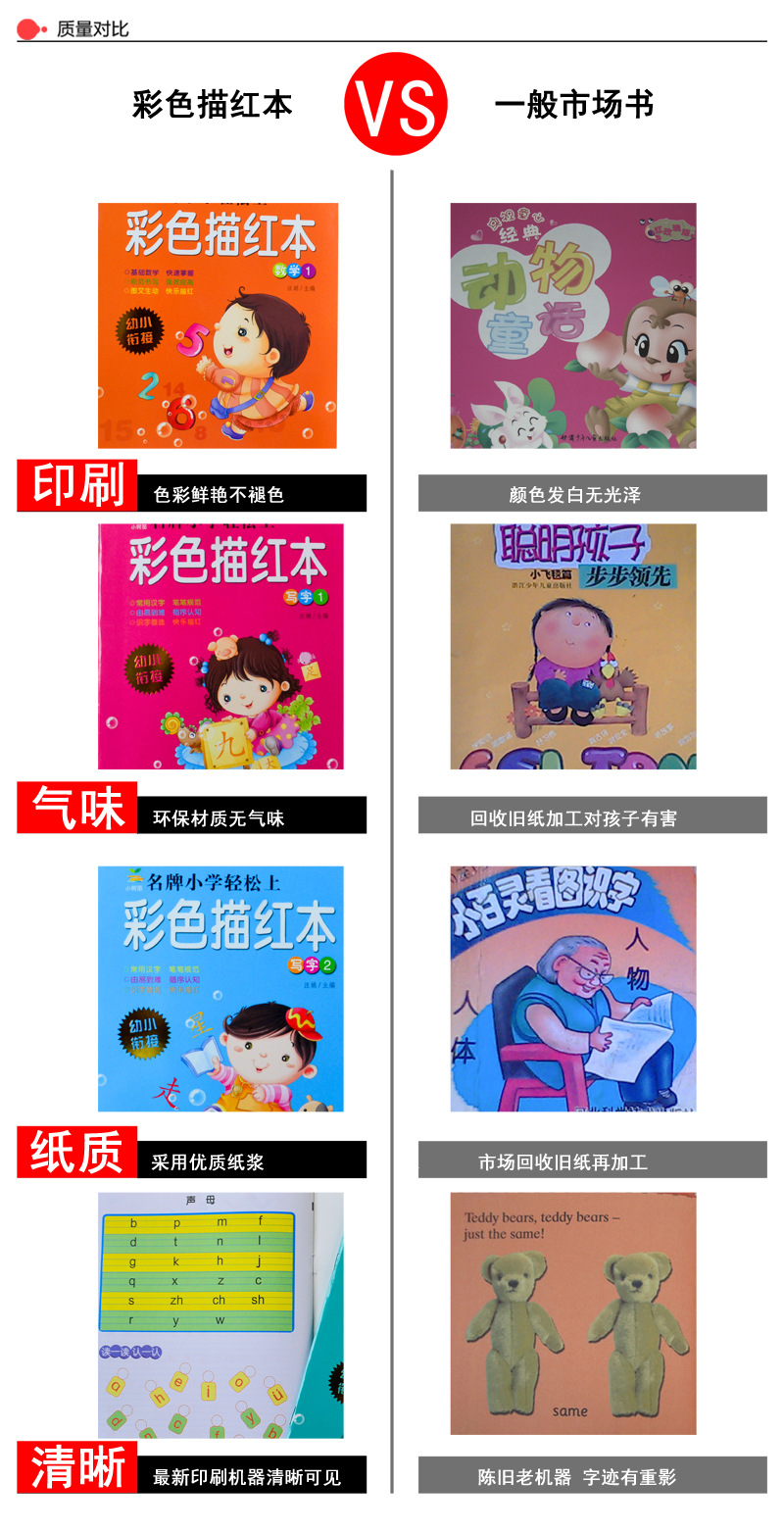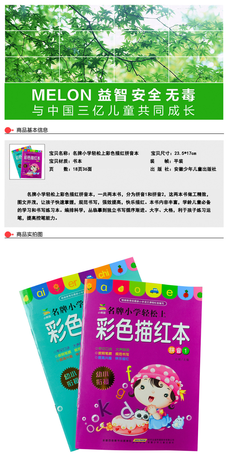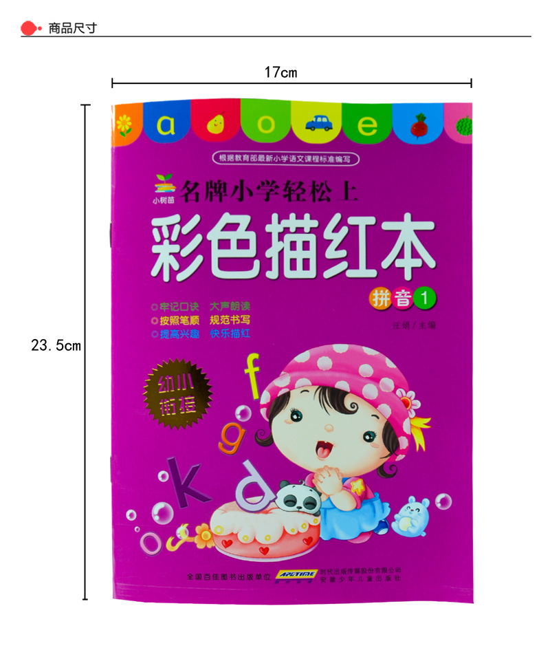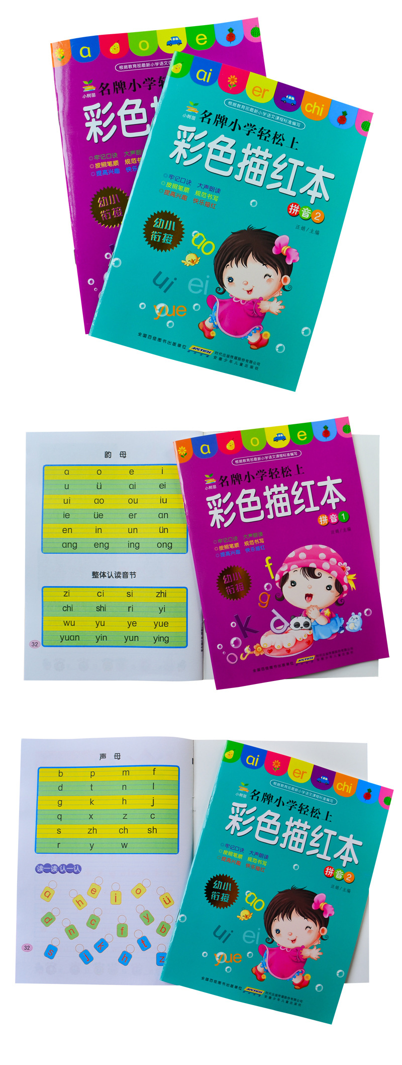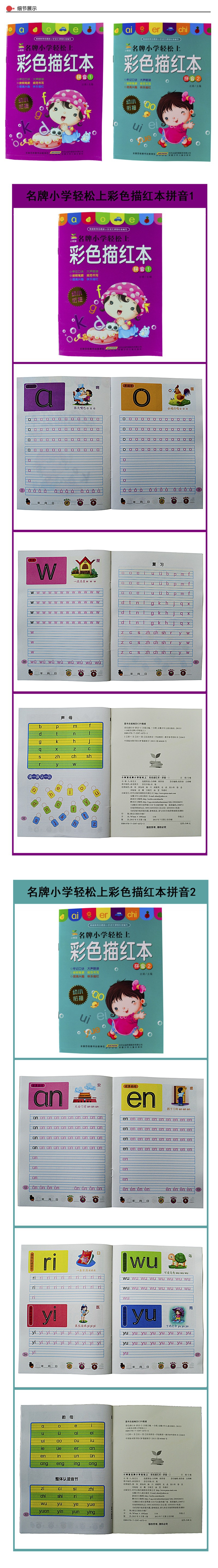 小学轻松上彩色描红拼音本,一共两本书,分为拼音1和拼音2,这两本书做工精致,图文并茂,让孩子快速掌握,规范书写,强效提高,快乐描红。本书内容丰富,学龄儿童必备的学习和书写练习本。编排科学,丛临摹到独立书写循序渐进。大字、大格,利于孩子练习运笔,提高控笔能力。