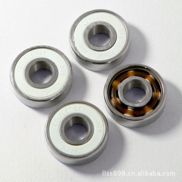 Si3N4 陶瓷的密度为3.20g/cm3 比轴承钢7.85g/cm3 的密度要低得多。所以陶瓷滚动体能有效抑制高速转动产生的离心力,降低滚动体载荷。同时可以减少滚动体与滚道面之间的旋转滑动,对防止表面损伤起到有益的作用。因此,混合陶瓷球轴承是用于高速运转领域的最佳选择,例如高速主轴轴承、机床主轴轴承、牙钻轴承、高速磨头轴承、仪表用轴承、硬碟驱动器轴承等。还能够应用于诸如溜冰鞋和电动玩具等民用产品。