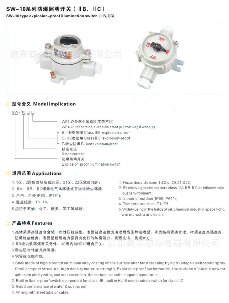 ◆ 用作照明线路的开关控制。 森本防爆电器有限公司专业生产防爆配电箱,防爆控制箱,防爆动力检修箱,防爆灯,防眩泛光灯,,防爆启动器,防爆接线盒,防爆荧光灯,防爆应急灯,防爆标志灯,防爆安全出口灯, 防爆空调,防爆软管,防爆接头。。。。欢迎前来咨询!!!