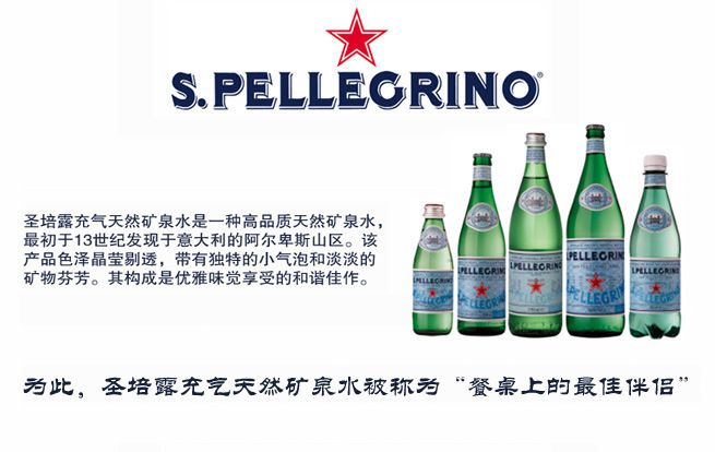 圣培露S.PELLECRINO是13世纪首种意大利阿尔卑斯山发现的质量一流的天然矿泉水。它纯然润泽,精致的气泡和微妙的矿物味道使其更显卓著非凡。其构造是一件味觉上高雅谐和的艺术品。正是因为她唯一无二的品质,圣培露可以很好地与红酒、酒精度较高的玫瑰酒,以及醇香浓郁的高度烈酒谐和地搭配。在美味纷呈的大餐上,她确实是您的完美伴侣。