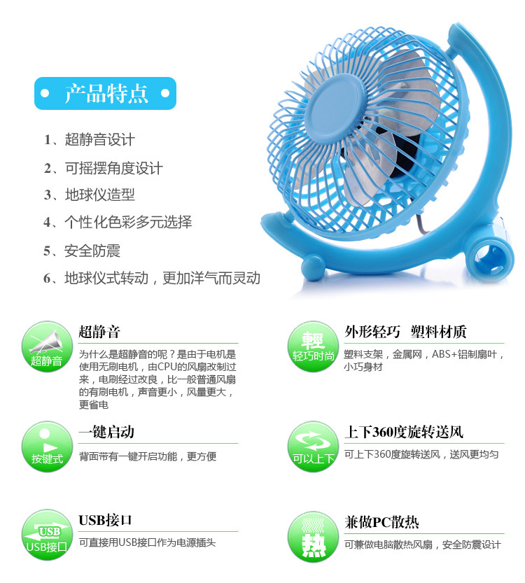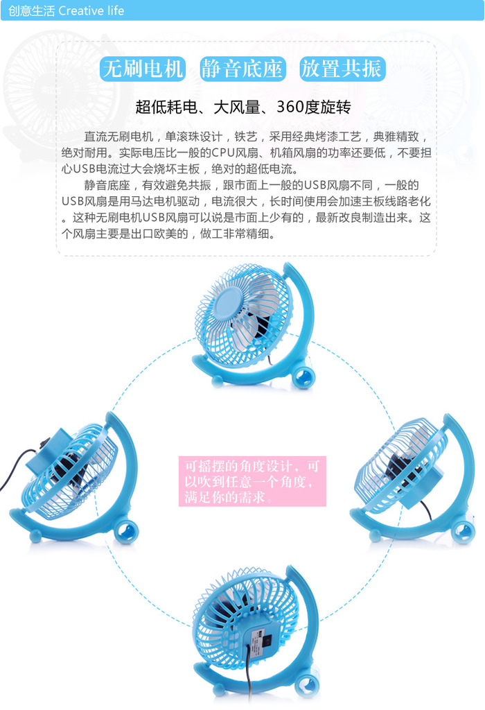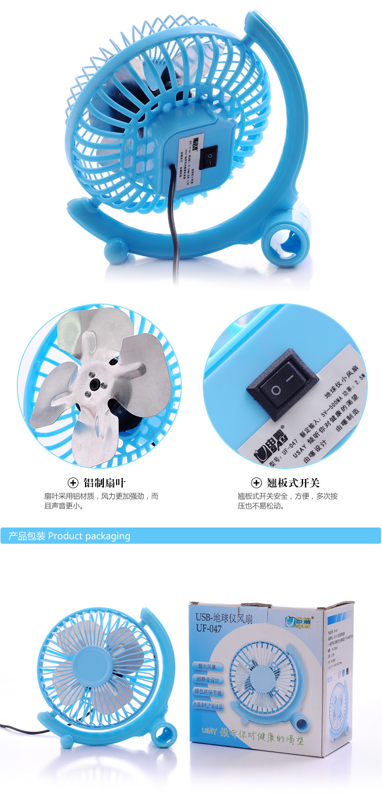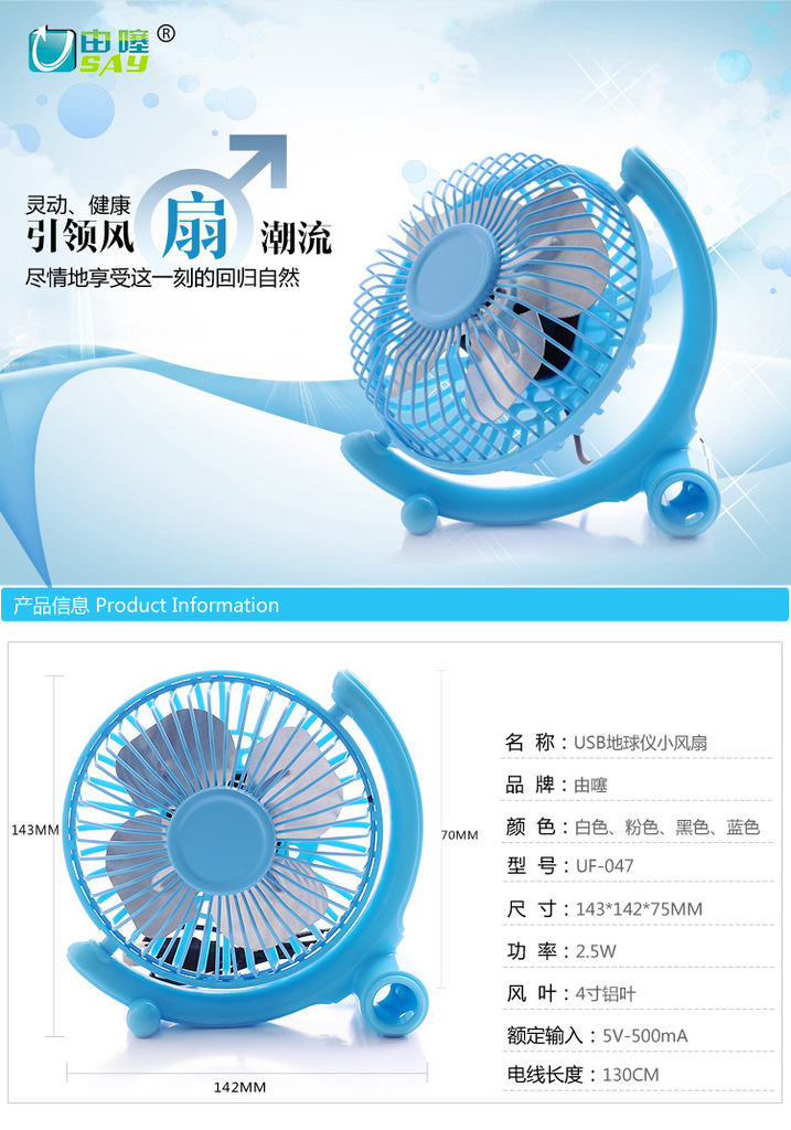 欢迎批发正品 “欧伟工艺”产品 专利所有,侵权必究! 【名 称】:由 噻USB风扇 【货 号】:UF-047 【产品尺寸】 :143X70x142mm 【颜 色】 :黑、红、绿、蓝或定制 【材 质】 :金属框 铝叶 【功 率】:2.5W. 【电 压】:DC5V. 【装箱数量】 :48/pcs 【一个净重】 :0.3kg 【外箱尺寸】 :63*32*48cm 新研发产品---USB 风扇。新款迷你风扇 金属外壳,外观精美小巧,上下仰俯角 度可调整,功率低电流小,不用担心因为电流过高烧坏电。 我们是怎么样的一个公司? 义乌市欧伟工艺品有限公司是集研发, 设计,生产,销售一体的创新型企业,旗下由噻(USAY)品牌致力于打造中国USB风 扇第一品牌,办公室空气净化相关产品的第一品牌,是白领上班族改善工作环境的最强品牌,以超强的创新设计能力占领国内外市场。公司设计开发的USB超静音风扇以其实用性及经典的外观深受白领的欢迎。 我们公司的强项:创新设计,质量第一。创意礼品设计开发,生产,销售,配送,全方位服务。 USAY重金投入,培养人才,组建专属于USAY的设计、研发团队。每一位研发人员都是USAY精心挑选,用心培育 的专业人才。他们有敏锐的市场洞察力,能够及时掌握市场动向,研发出最迎合 市场需求的产品;他们有三过家门而不入的敬业精神,对产品研发的每一个环节都有锱铢必较的精神,尽力做出最完美的产品;他们有丰富的专业知识,并能熟 练运用于实际操作中,保证每一款产品都性能稳定、设计前卫、功能强大。 义乌市欧伟工艺品有限公司拥有4个大型生产车间,分别为注塑车间、五金车间、电机车间,形成原材料加工到成品组装一条龙,产成品在厂里完成,从上游控制质量,生产质量更优秀的产品。拥有100位生产一线员工。所有产品均为流水线作业 ,每个环节都严格把关,最大限度降低次品产出概率,使消费者买的放心,用的舒心。义乌市欧伟工艺品有限公司对品质的管理相当严格,每一批成品都经过严格把关,决不让任何次品流入市面,这就是USAY对品质的执着追求! 感受USAY的魅力,专注健康的价值 !创意礼品 本公司销售多种优质产品,价格公道,产品质量优质,欢迎新老客户来电具体详谈。我们的宗旨是“小胜凭智,大胜靠德 ”,我们本着“诚信第一”“专业专注”、“ 服务一流”的态度立足。目前旗下有专业风扇生产线日产10000台USB小风扇,是国内最大的铁艺USB风扇生产厂家。电机生产线2条,日产10000台电机,达到风扇电机自足。另外加湿器, 空气净化器,办公取暖器等深受广大白领的欢迎。 热诚欢迎各界前来参观 、考察、洽谈业务 产品售后说明: 本产品三个月接受一次有质量问题的产品,即购买日起的第三个月,可将有质量问题的产品一次性发往本厂进行调换货处理,来回运费由买家承担,本厂不接受到付的返厂产品。创意礼品 |