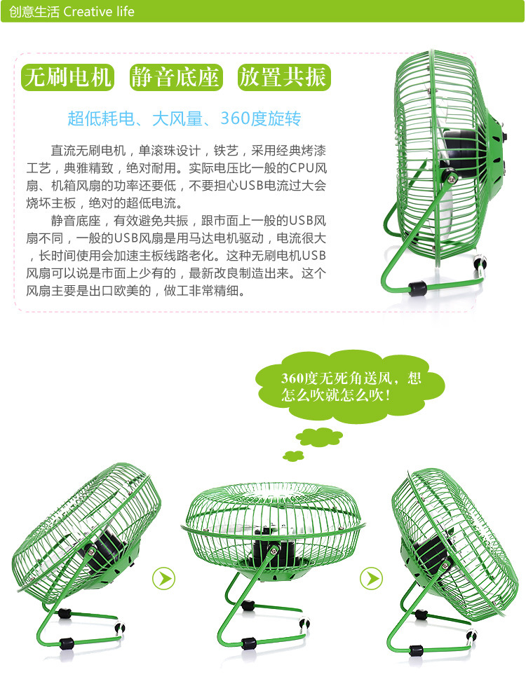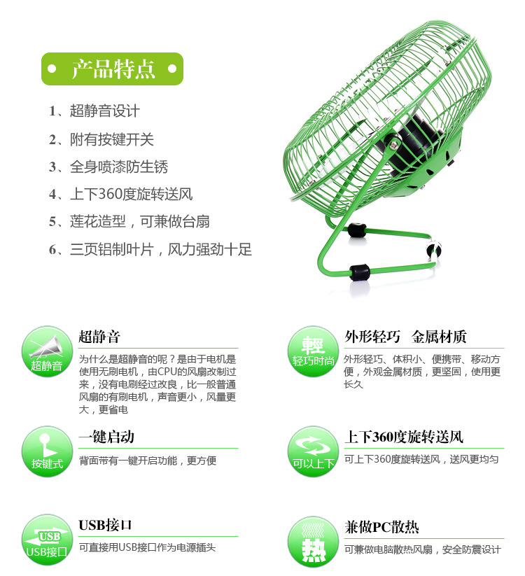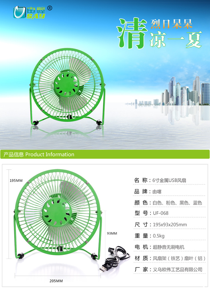 欢迎批发正品 “欧伟工艺”产品 专利所有,侵权必究! 【名 称】:由 噻USB风扇 【货 号】:UF-068 【产品尺寸】 :195x93x205mm 【颜 色】 :黑、红、绿、蓝或定制 【材 质】 :金属框 【功 率】:2.5W. 【电 压】:DC5V. 【装箱数量】 :18/pcs 【一箱毛重】 :13kg 【外箱尺寸】 :63*32*48cm 新研发产品---USB 风扇。新款6寸风扇 金属外壳,外观精美小巧,上下仰俯角 度可调整,功率低电流小,不用担心因为电流过高烧坏电。 我们是怎么样的一个公司? 义乌市欧伟工艺品有限公司是集研发, 设计,生产,销售一体的创新型企业,旗下由噻(USAY)品牌致力于打造中国USB风 扇第一品牌,办公室空气净化相关产品的第一品牌,是白领上班族改善工作环境的最强品牌,以超强的创新设计能力占领国内外市场。公司设计开发的USB超静音风扇以其实用性及经典的外观深受白领的欢迎。 我们公司的强项:创新设计,质量第一。创意礼品设计开发,生产,销售,配送,全方位服务。 USAY重金投入,培养人才,组建专属于USAY的设计、研发团队。每一位研发人员都是USAY精心挑选,用心培育 的专业人才。他们有敏锐的市场洞察力,能够及时掌握市场动向,研发出最迎合 市场需求的产品;他们有三过家门而不入的敬业精神,对产品研发的每一个环节都有锱铢必较的精神,尽力做出最完美的产品;他们有丰富的专业知识,并能熟 练运用于实际操作中,保证每一款产品都性能稳定、设计前卫、功能强大。 义乌市欧伟工艺品有限公司拥有4个大型生产车间,分别为注塑车间、五金车间、电机车间,形成原材料加工到成品组装一条龙,产成品在厂里完成,从上游控制质量,生产质量更优秀的产品。拥有100位生产一线员工。所有产品均为流水线作业 ,每个环节都严格把关,最大限度降低次品产出概率,使消费者买的放心,用的舒心。义乌市欧伟工艺品有限公司对品质的管理相当严格,每一批成品都经过严格把关,决不让任何次品流入市面,这就是USAY对品质的执着追求! 感受USAY的魅力,专注健康的价值 !创意礼品 本公司销售多种优质产品,价格公道,产品质量优质,欢迎新老客户来电具体详谈。我们的宗旨是“小胜凭智,大胜靠德 ”,我们本着“诚信第一”“专业专注”、“ 服务一流”的态度立足。目前旗下有专业风扇生产线日产10000台USB小风扇,是国内最大的铁艺USB风扇生产厂家。电机生产线2条,日产10000台电机,达到风扇电机自足。另外加湿器, 空气净化器,办公取暖器等深受广大白领的欢迎。 热诚欢迎各界前来参观 、考察、洽谈业务 产品售后说明: 本产品三个月接受一次有质量问题的产品,即购买日起的第三个月,可将有质量问题的产品一次性发往本厂进行调换货处理,来回运费由买家承担,本厂不接受到付的返厂产品。创意礼品 |