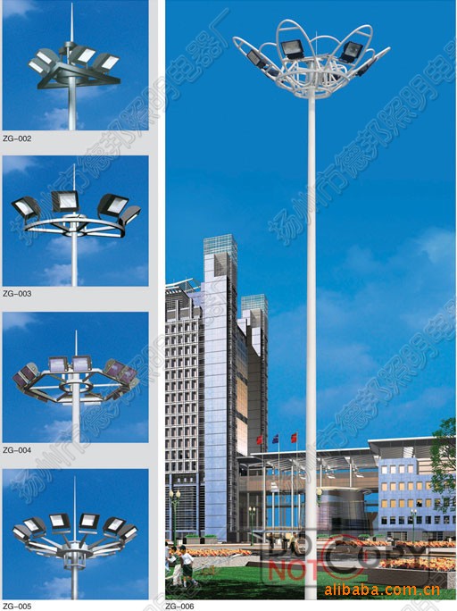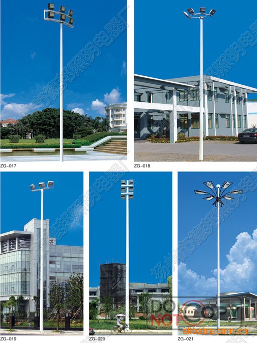 高杆灯:一般指15米以上钢制柱型灯杆和大功率组合式灯架构成的新型照明装置。它由灯头、内部灯具电气、杆体及基础部分组成。灯头造型可根据用户要求、周围环境、照明需要具体而定;内部灯具多由泛光灯和投光灯组成,光源采用NG400高压钠灯,照明半径达60米。杆体一般为圆柱型独体结构,用钢板卷制而成,高度为25—40米指25米以上钢制柱型灯杆和大功率组合式灯架构成的新型照明装置。它由灯头、内部灯具电气、杆体及基础部分组成。灯头造型可根据用户要求、周围环境、照明需要具体而定;内部灯具多由泛光灯和投光灯组成,光源一般采用高压钠灯和金卤灯。,照明半径达60米。杆体一般为圆柱型独体结构,用钢板卷制而成,高度为15—40米。