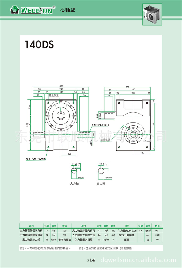 WELLSUN/威尔顺平台型分割器(80DT,110DT,140DT,180DT,210DT,250DT,350DT,438DT)1,具有固定中空轴特性,最适合自动化组立运用。2,可承载较大直径的盘面,适用较大负荷之回转台式圆盘驱动场合。3、只适合水平安装,无法垂直及倒立安装,此系列机种之尺寸设计特性与凸緣型弁酮萓A于驱动运转上可承受超大轴向负载及垂直径向压力,在输出端有一凸起固定盘面及大孔径空心轴,可搭配设置动态、静态自动化周边设备,可将动力源之电、油、气管路置于空心孔內,此系列机种广泛应用于重负载、直接自动化设备之各类机构及产业机械,作同步自动化間歇驱动。