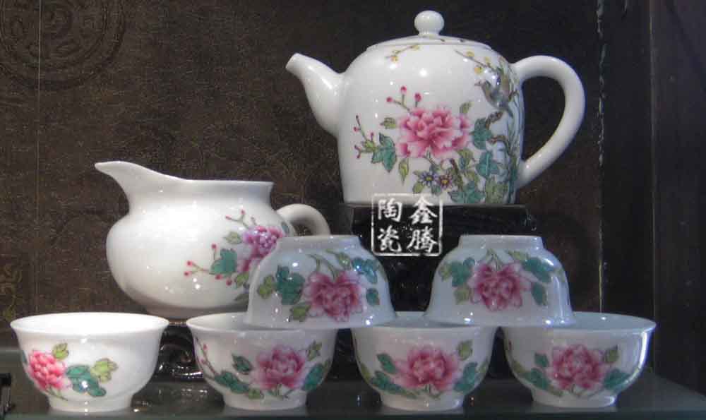 QQ:1637698949手机:18979804799(周献龙)网址: 景德镇鑫腾陶瓷经营部生产供应陶瓷茶具,高档手绘陶瓷茶具,功夫茶具,礼品茶具,时尚家居用品茶具,陶瓷日用品茶具,家居礼品陶瓷茶具,骨瓷茶具,定做礼品茶具饮茶离不开陶瓷茶具,茶具是指泡饮茶叶的专门器具,包括壶,碗,杯,盘,托等,古人讲究饮茶之道的另一个重要表现,是非常注重陶瓷茶具的本身的艺术,一套精致的茶具配合色,香,味三绝的名茶,可谓相得益彰。随着饮茶之风的兴盛以及各个时代饮茶风俗的演变,茶具的品种越来越多。我公司生产的景德镇陶瓷茶具造型优美、品种繁多、装饰丰富、风格独特。瓷质"白如玉、明如镜、薄如纸、声如磬"。有手绘青花、粉彩、玲珑、颜色釉各种样式。还可以根据您的需要印制您需要的各种图片、添加公司LOGO图形和文字等。 鑫腾陶瓷:作为一家植根与千年瓷都景德镇的陶瓷企业,我公司生产加工的礼品工艺陶瓷产品全部为高级工艺美术师精心设计,经过1300度以上高温烧制而成的精美陶瓷艺术礼品,永不褪色变色。是温馨相送、友谊联络、喜庆贺礼、工商馈赠、师生情谊、敬意表达、励志名言及节日纪念等传达非凡感受的最佳礼物。选择鑫腾,品质的保证;欢迎各界有识之士光临我公司参观指导!(出厂价供货,价格最优!)同时我公司还提供各类陶瓷工艺品、陶瓷纪念品、陶瓷礼品的设计加工和来样定做。