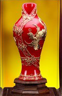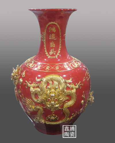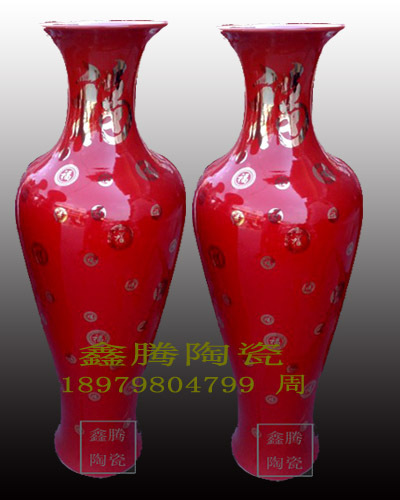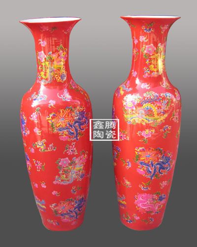 中国红大花瓶多用于大厅、门厅、客厅等摆设,主要用于开业礼品,大楼建筑落成、工程竣工开业、奠基典礼、酒店宾馆陈设、企事业单位乔迁、周年纪念 、学校校庆、搬迁新居等。有特殊需要,在大花瓶身上可烧制LOGO、公司名称、人名、赠言,纪念用语,年月日等。全手工绘制,高白泥手工拉胚,高白釉上底色。陶瓷大花瓶要经过淘泥、摞泥、拉坯、修坯、绘画、上釉、烧窑、成瓷等近七十道工艺才能制做完成。
