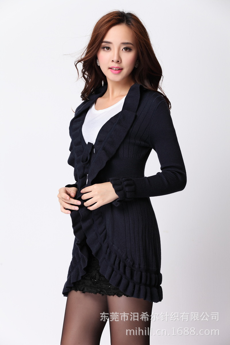 汨希尔 2013秋冬装新款羊绒通勒长袖荷叶领修身女装开衫针织衫