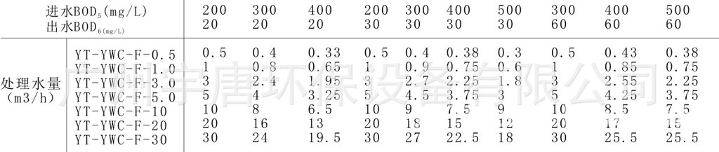 YT-YWC-F一体化污水处理设备处理水量与进、出水BOD5关系表