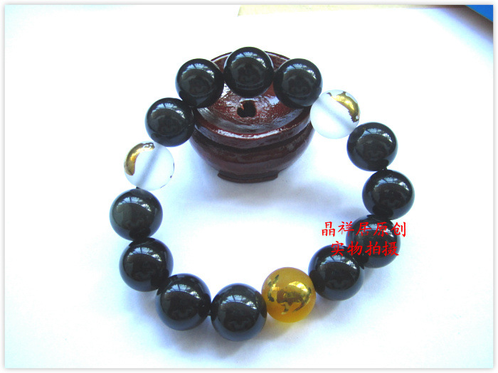 【品名】晶祥居批发供应天然黑曜石三合生肖手链猪兔羊三合贵人吉祥辟邪