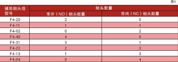 ● 接触器本体是在32A及以下有一对常开或常闭辅助触头,40A及以上有一对常开和常闭辅触头。另外可加装F4辅助触头组成(两组或四组)其组合情况(见表4)
