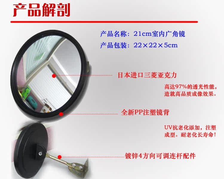 安装在超市、商店、商场等室内死角处可让该地方处于工作人员监控范围内,并起到防盗的作用。工厂车间、企事业单位、实验室可规范人员来往注意安全通行及开阔视线。地下停车场安装本产品可防止车辆转弯前及时了解道路另一端的情况,避免发生与迎头过来的车辆相撞等功能。产品常用于超市、商店、商场、地下停车场、地铁站、工厂车间、企事业单位、实验室等室内需要监控的场所。