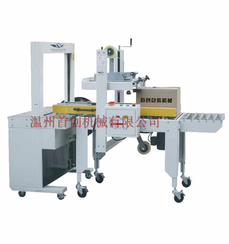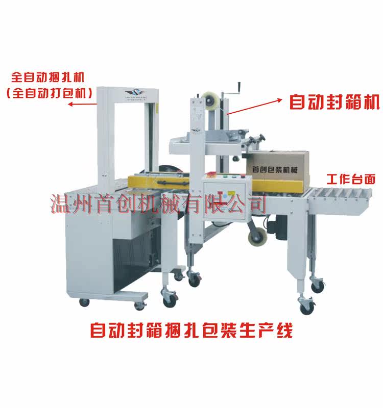 自动封箱打包机是一种集自动封箱及打包为一体的包装机,可配套自动化包装流水线使用,自动上下封胶带、多道打包,实现后道无人化包装。工作效率高。本条生产线的生产流程为:人工把纸箱底部折好,放到封箱机工作台板上面,然后往里面装产品,人工把纸条上盖折好,然后推入至封箱机,由封箱机皮带输送进去,进行上下同时封箱,封箱完成后,由封箱机两侧输送台,把纸箱输送至全自动打包机当中,全自动打包机感应到纸箱过来的,便自动打包,第一道打包完成后,设备会自动把纸箱输出一定距离,然后进行第二道打包,然后再输送出去,打包便完成。