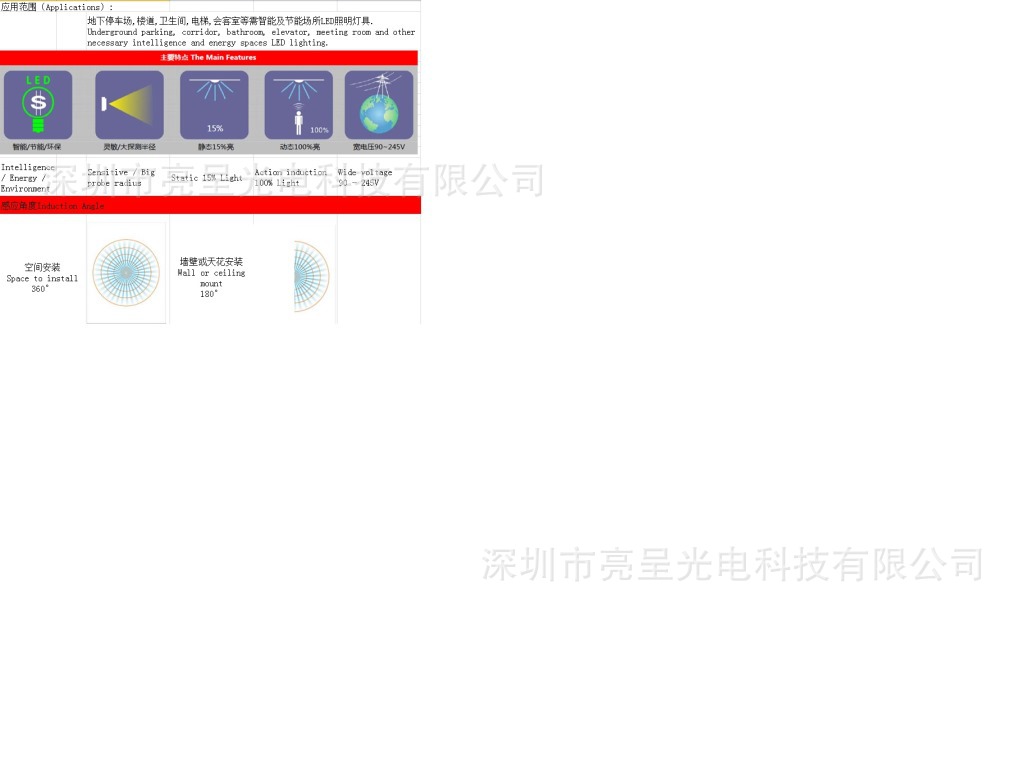 深圳市亮呈光电科技有限公司是一家集LED灯具研发、生产、销售为一体的专业高科技制造业企业,产品范围涉及室内照明、商业照明、情景照明、室外照明和景观照明等。主要生产LED灯杯、LED轨道灯、LED天花灯、LED豆胆灯、LED灯泡、LED 筒灯、LED吸顶灯、LED日光灯、LED平板灯、LED蜡烛灯、LED横插灯、LED玉米灯,LED投光灯、LED埋地灯、LED水底灯、LED洗墙灯、LED隧道灯、LED路灯、LED工矿灯、LED庭院灯和LED线条灯等。产品款式新颖、规格齐全,广泛应用于各种照明场所,如酒店,商场,公园、公路、办公室、车间、商铺、柜台、家居和娱乐场所等,可以直接替代所有的传统灯具和光源,比传统灯具和光源节能降耗达70-90%。