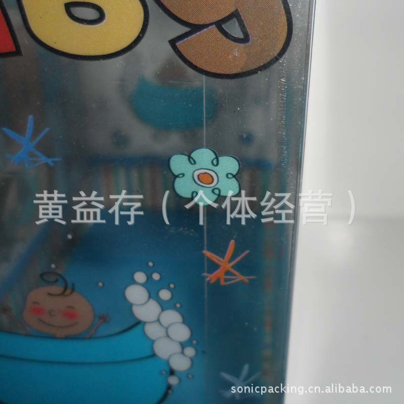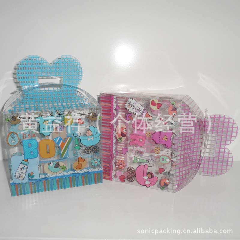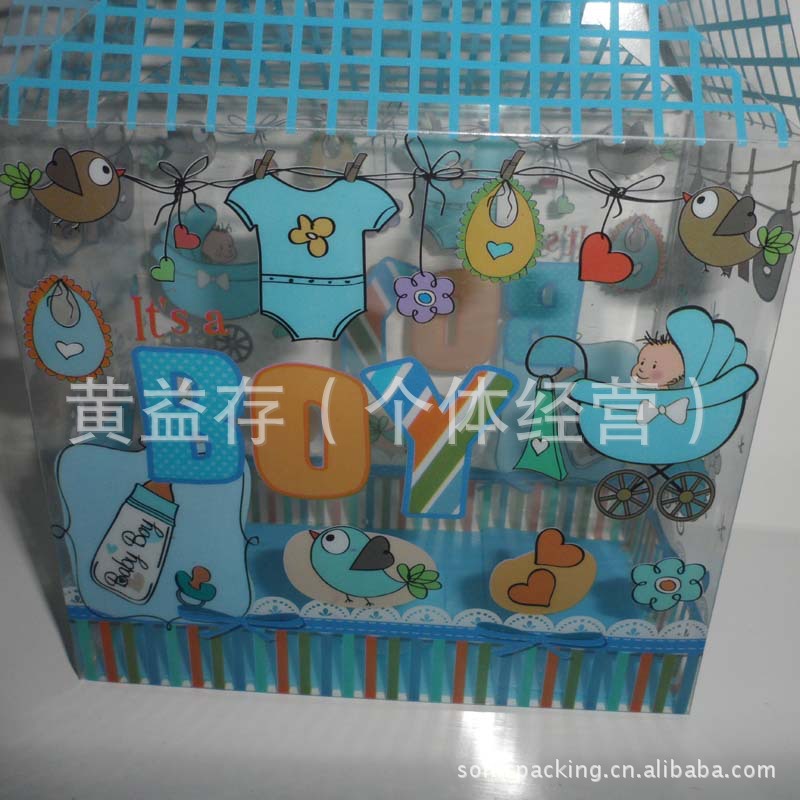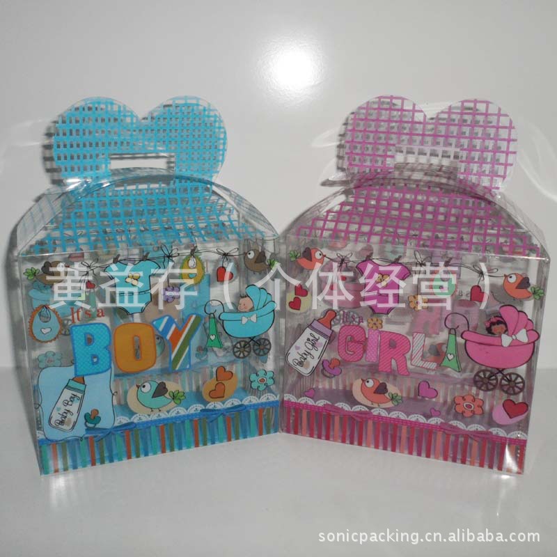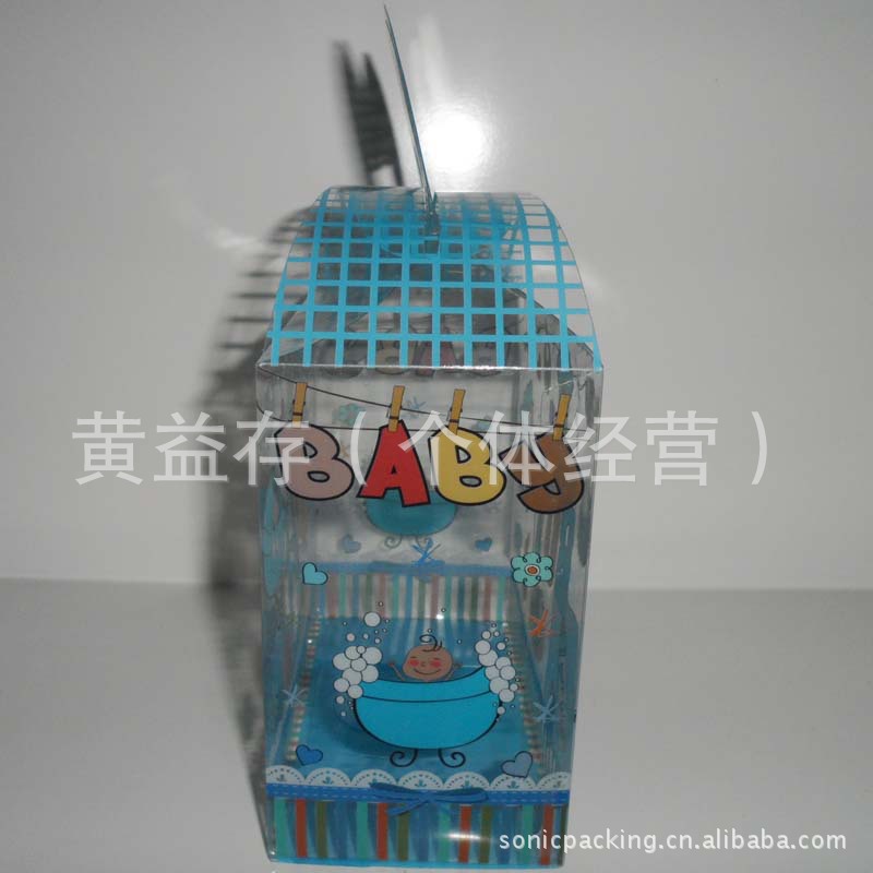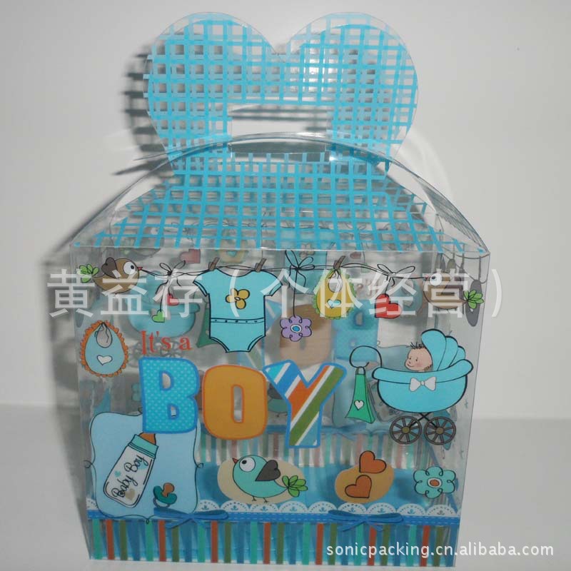 【产品描述】:整个包装盒可爱童趣,采用优质透明PVC材料,多色印刷;盒子正背面印有各式幼儿儿童用品图案,底部带花式盒扣;使用的材料厚度是0.21MM,软硬度适中;有蓝色、紫色可选;整体而言,是一款小巧精致的礼品包装盒。