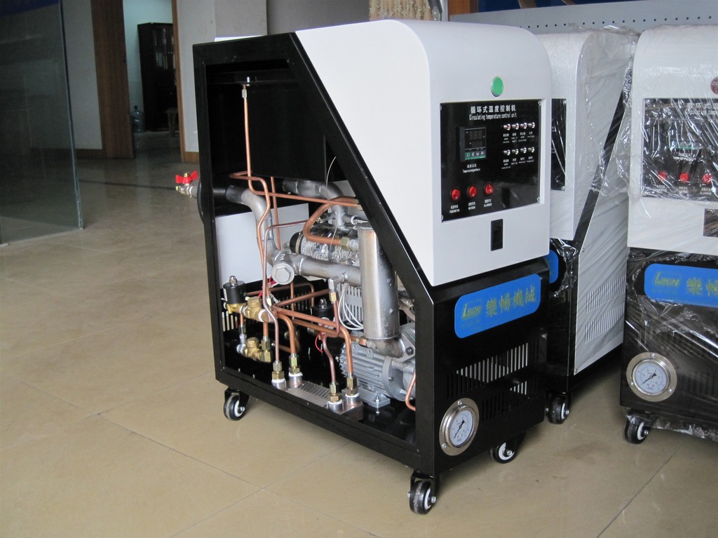 机器配置: 1.发热管及泵浦的控制电器采用原装施耐德; 2.装配空气开关; 3.中外合资电脑板(康珑)PID±1℃; 4.装配进口超压保护及压力显示表,确保管路安全; 5.台湾元欣及东元泵浦(连轴泵),耐高温350℃,保证长期使用; 6.大流量板式热交换器; 7.原装意大利进口ULKA加压泵; 8.台湾进口UNID鼎机电磁阀; 9.台湾SS安全开关; 10.欧姆龙不锈钢探头,缺水感应; 11.出水及回水主管道采用304不锈钢一体成型,管壁厚4mm; 12.304不锈钢加热器(直径76mm,厚5mm),不锈钢316材质发热管(无缝钢管),厚1mm;内置瑞典进口粉体;发热管配备304法兰,厚8mm;安装维修更简易方便; 13.铸件分流器配截阀,确保分流均匀; 14.隔离式电控箱,电器免受高温环境运行,延长电器使用年限; 15.BY-PASS泄压设计,平衡压力,分流;同时可选配吹气回水功能; 16.配备逆相、缺相、缺水、过载、超温、超压、过载、管路防爆、开机自动排气等保护功能; 17.数控机架厚2mm,侧板1.5mm,隔离式电控设计,烤漆; 机器参数: | 单位 | | | | | | | 温控范围 | ℃ | 150℃ | 150℃ | 150℃ | 180℃ | 180℃ | 180℃ | 温控精度 | PID±1℃ | 电源 | AC3相 380V 50HZ 3P+E(5M) | 传热媒体 | 水 | 冷却方式 | 间接冷却 | 发热功率 | KW | 6 | 9 | 12 | 6 | 9 | 12 | 泵浦马力 | HP | 1/2 | 1 | 2 | 1/2 | 1 | 2 | 泵浦工作流量 | L/min | 52 | 95 | 153 | 52 | 95 | 153 | 系统工作压力 | Kg/c㎡ | 6 | 6 | 6 | 11.5 | 11.5 | 11.5 | 最大电力耗损 | KW | 6.5 | 10 | 13.5 | 6.5 | 10 | 13.5 | 警报功能 | | 逆相/缺相/缺水/过载/超温/超压 | 冷却水配管 | | 1/2 | 1/2 | 1/2 | 1/2 | 1/2 | 1/2 | 循环水配管 | | 3/8x2 | 3/8x4 | 3/8x4 | 3/8x2 | 3/8x4 | 3/8x4 | 外形尺寸 | MM | 690*330*580 | 690*330*580 | | | | |