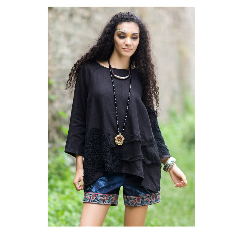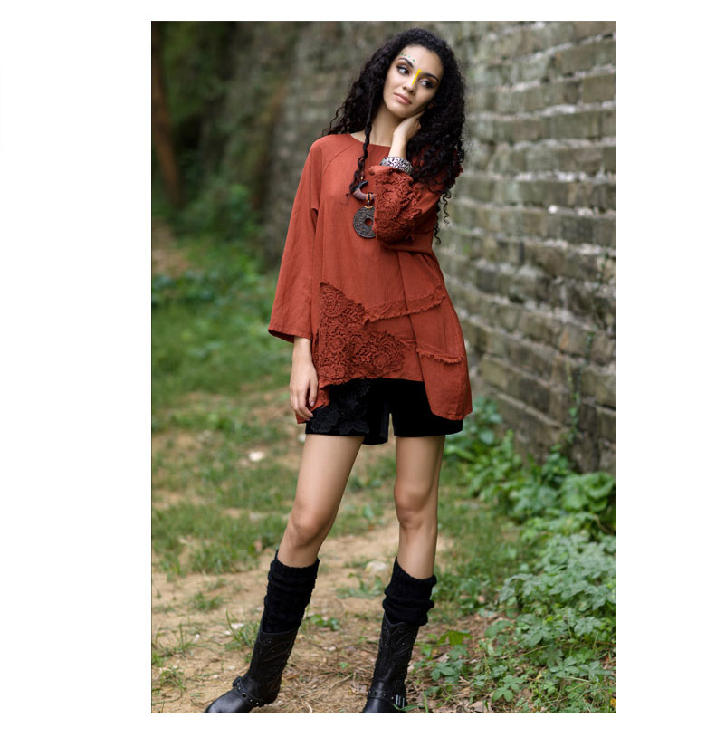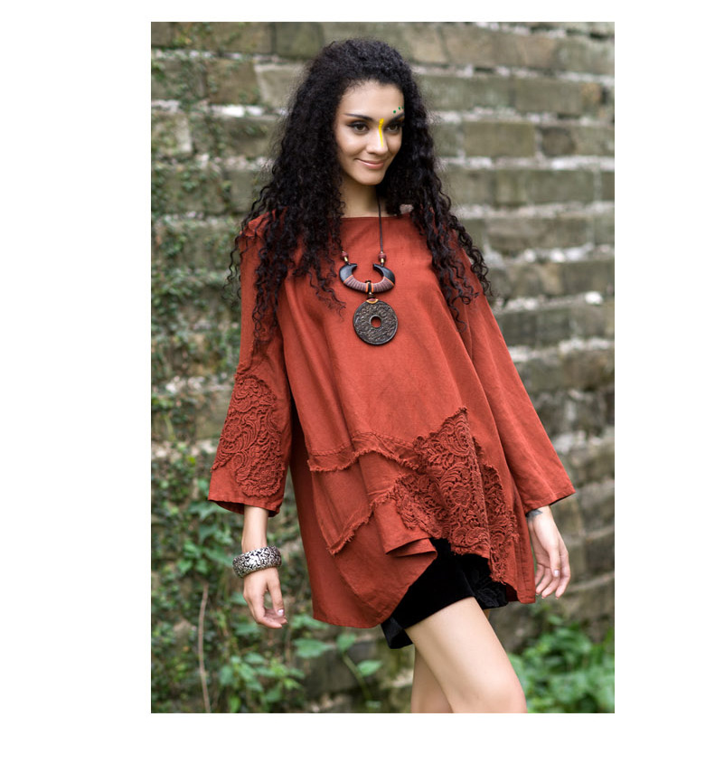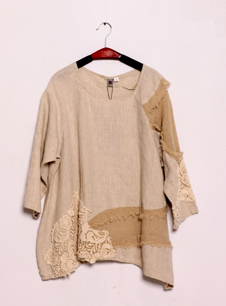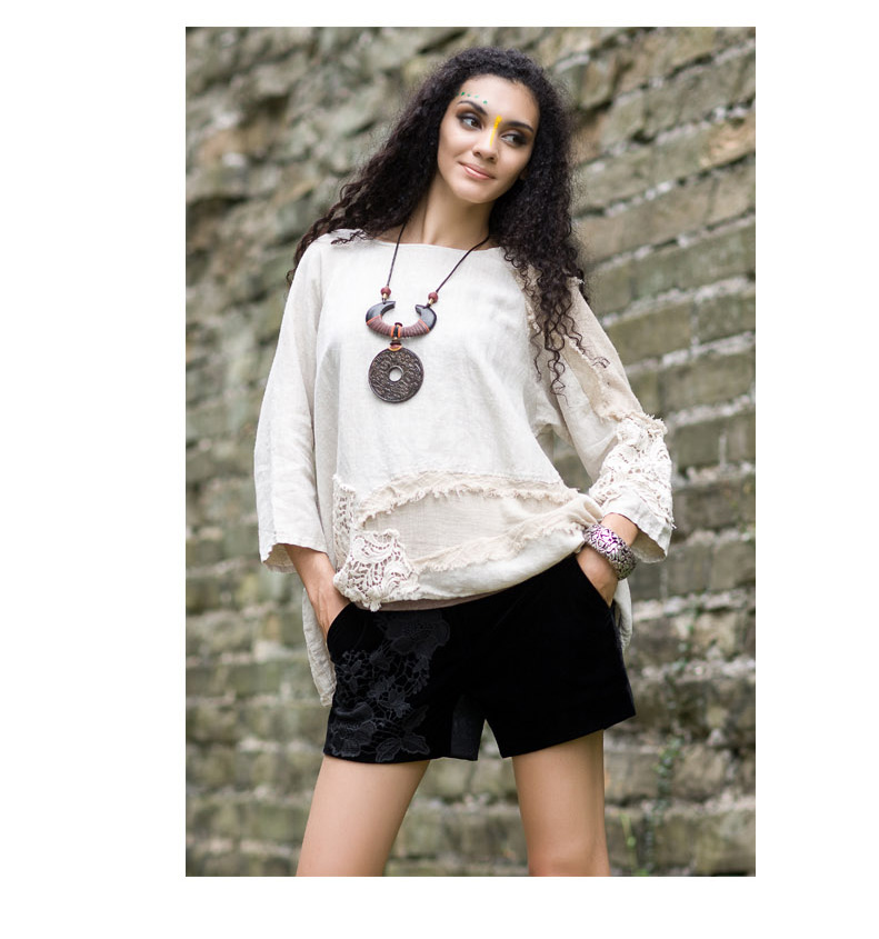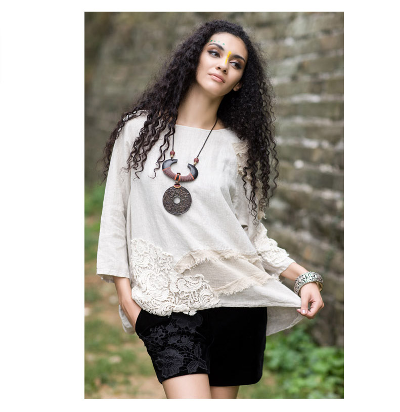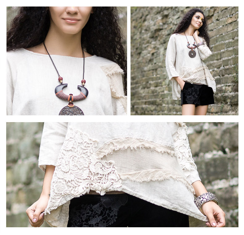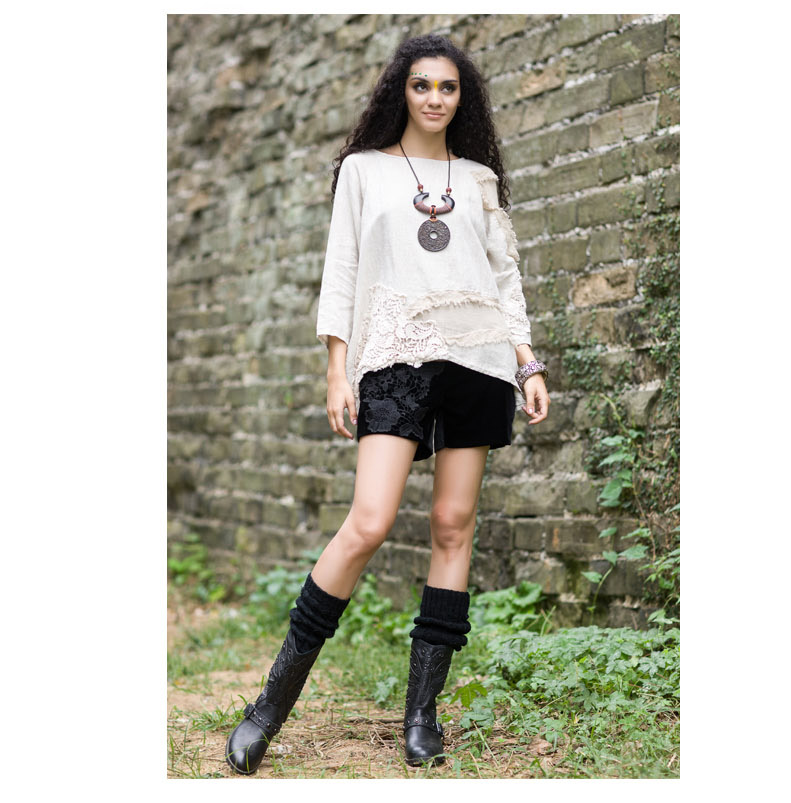 吉丘古儿原木味道2013秋款原创棉麻女装长袖圆领钩花蕾丝棉麻衬衫