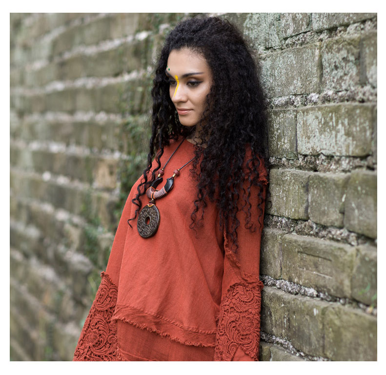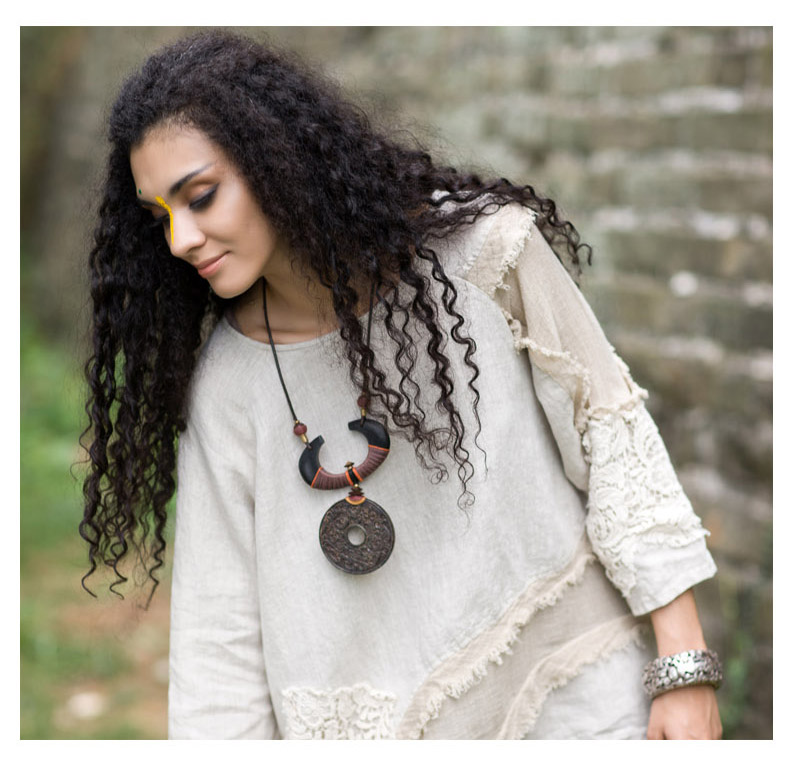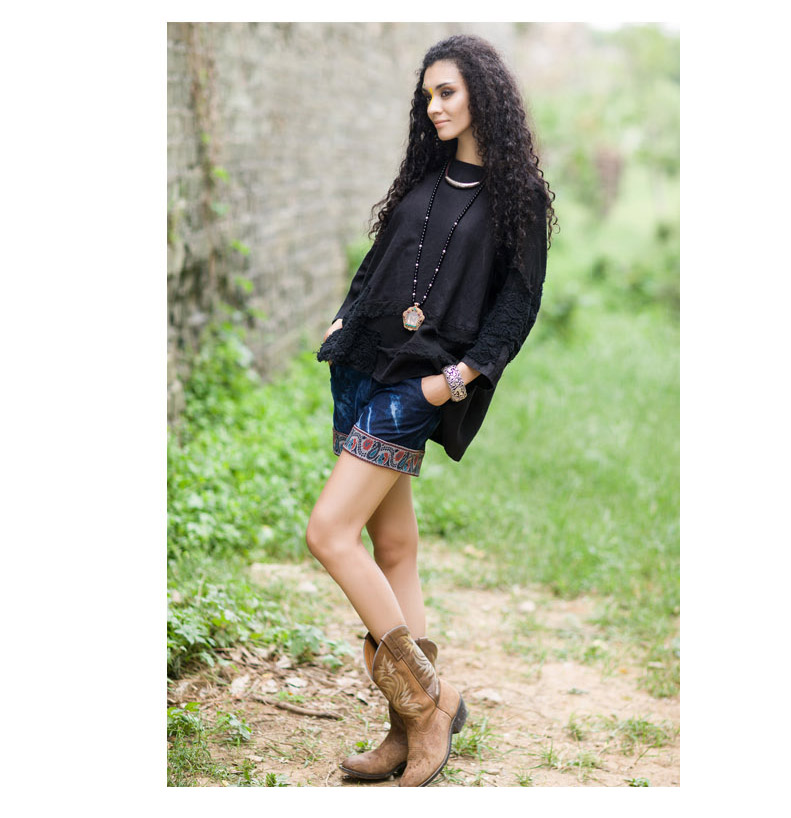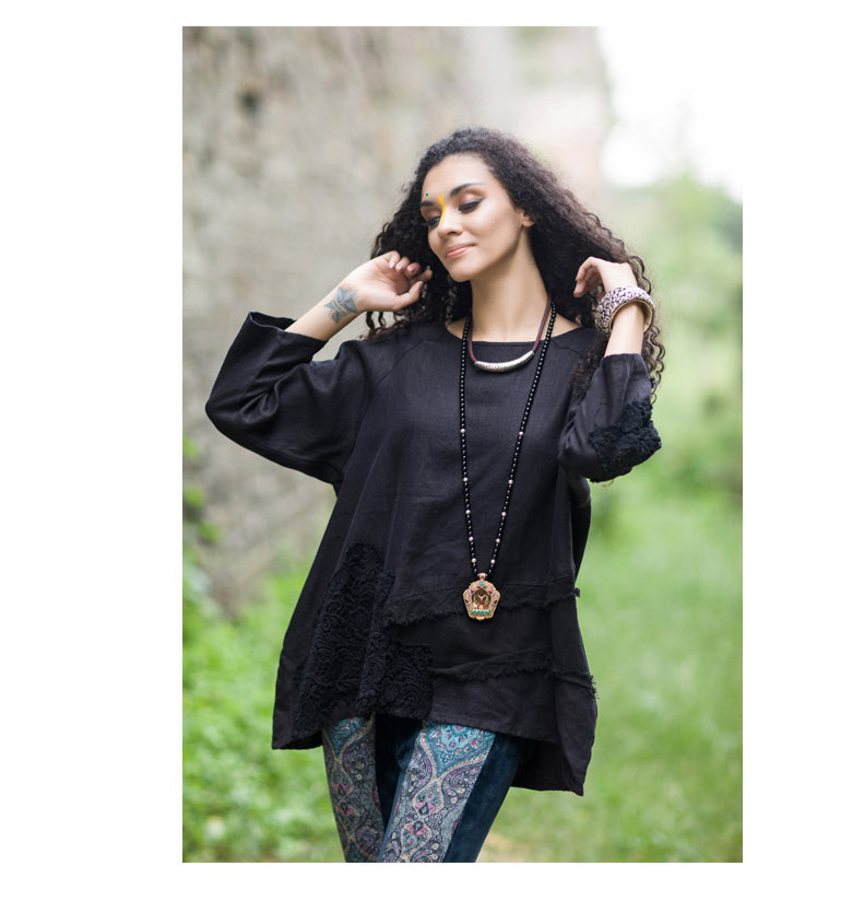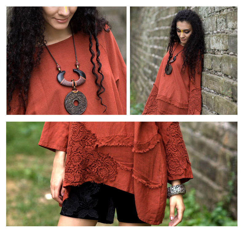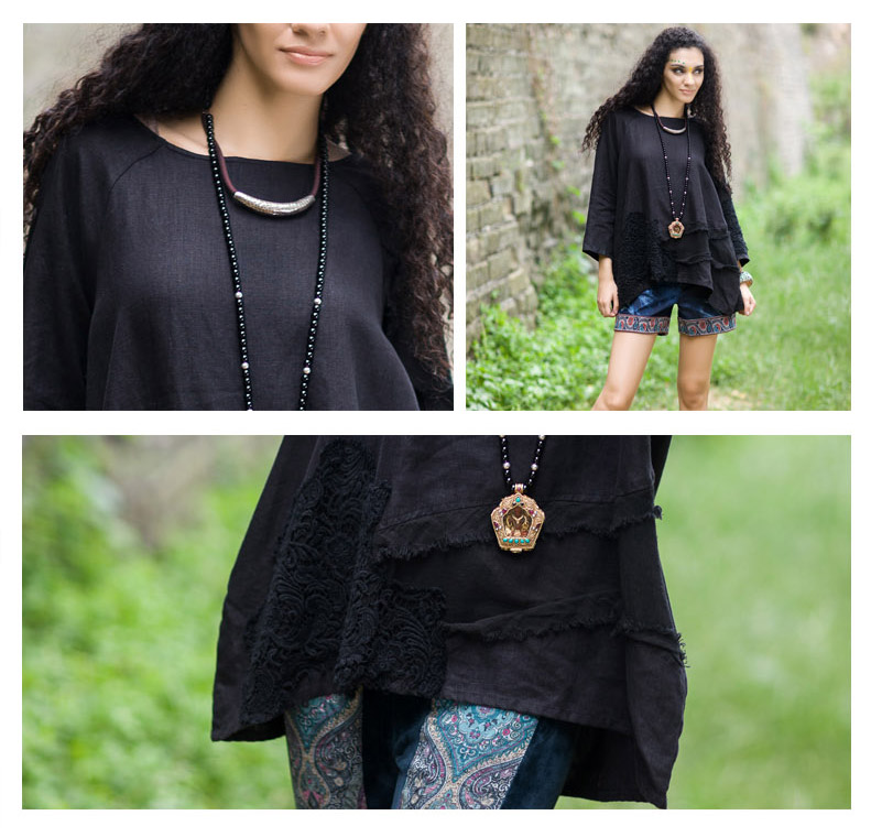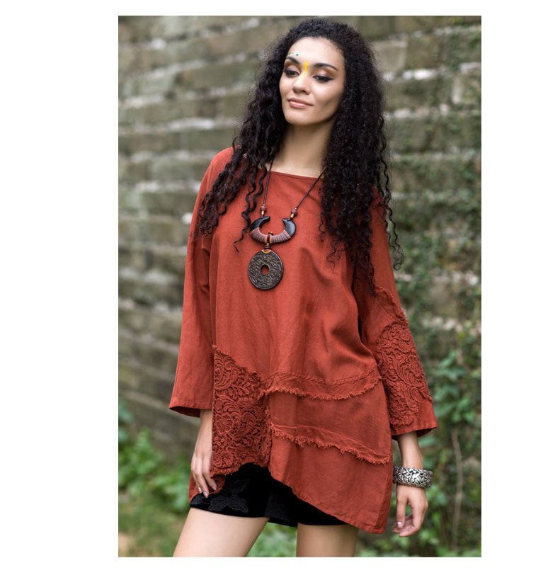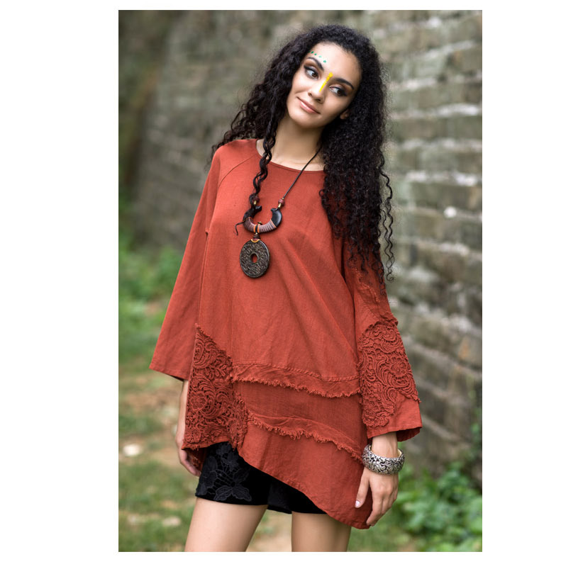 吉丘古儿原木味道2013秋款原创棉麻女装长袖圆领钩花蕾丝棉麻衬衫