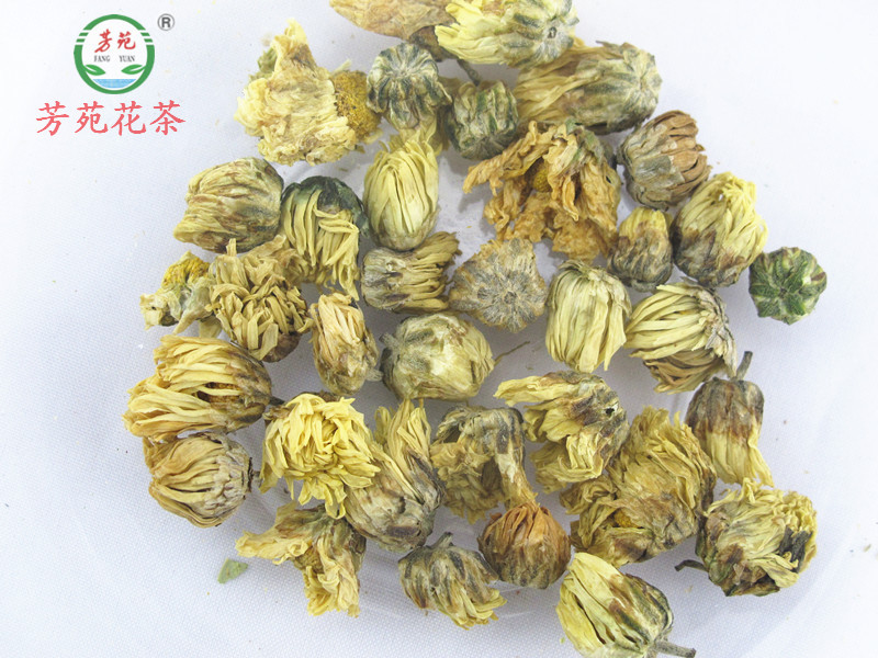 胎菊王,杭白菊未开放的花蕾叫做胎菊,而10月末第一批采摘质量最好的是名符其实的胎菊王。真品干花形态整齐、花瓣内敛蜷曲、色泽金黄、花蜜味香甜浓郁、手指轻捏立刻化为粉末。