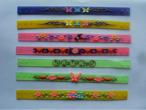 7.夜光硅胶手环:此类手环在炼胶的时候加入荧光粉一起混炼,成型的时候跟普通硅胶手环一样,需要在晚上才看得到荧光效果,有红光、绿光、蓝光,晚上,它更加引人注目。白天置于阳光下,夜晚或者在较黑暗的地方,能取得更加效果。
