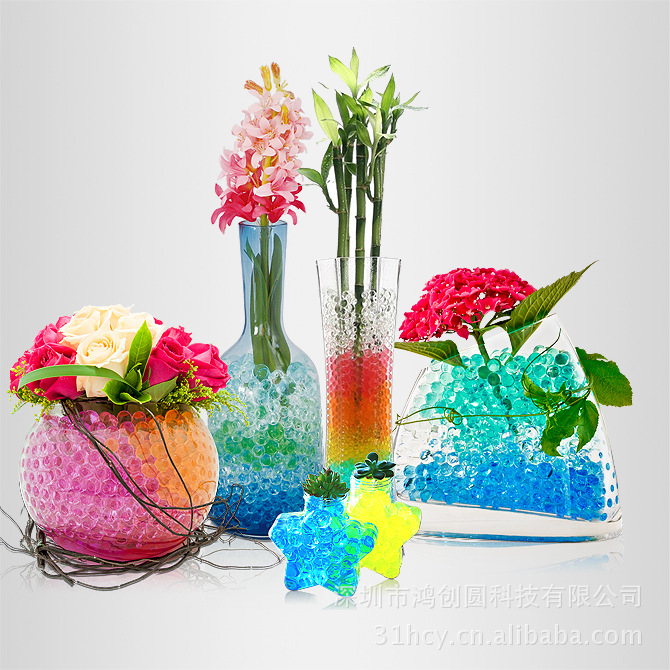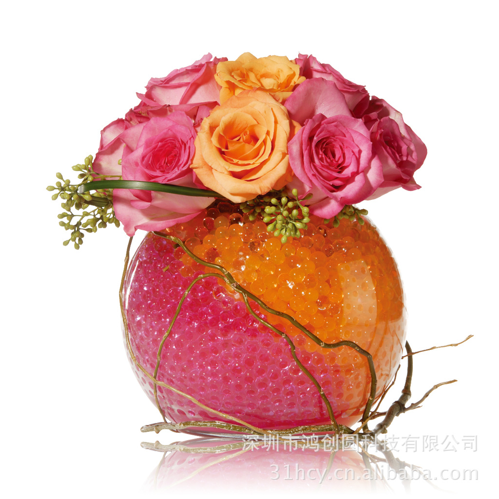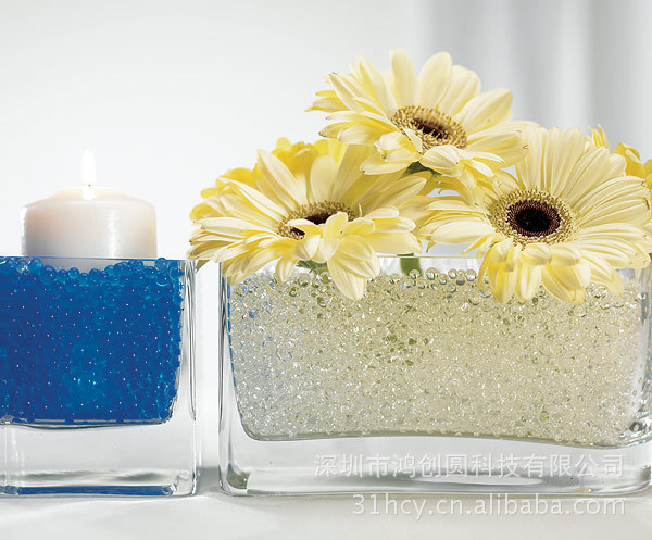 水晶泥是新型插花装饰产品。它是高吸水性树脂为基础加工而成的,是一种储存水分高吸水性载体。水晶泥在几小时内能够吸收高达自身重量150倍的水分。