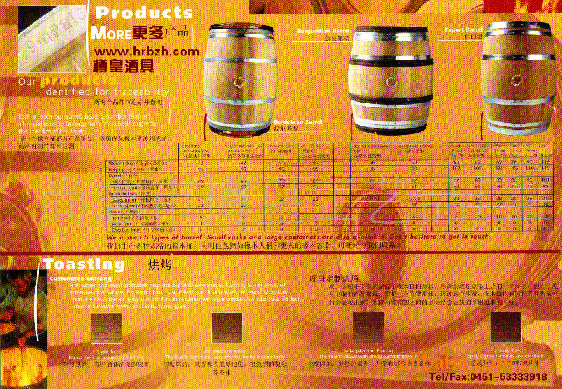 附:可根据要求生产各种类型、容量、用途的标准型、内胆型、装饰型橡木桶