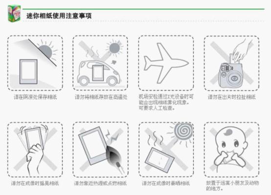 【胶卷的填装】填装时,注意将胶片包装上的黄线对准相机内部的黄线,请勿按压胶片表面的黑色部分及包装的凹陷部分。 【使用及保存上的注意事项】 1、为保证胶片质量,请在气温居于5-40摄氏度之间时使用。低温拍摄时,请立即将照片放到口袋里保温30秒。 2、照片拍出后、在画质稳定之前,请避免阳光直射。请勿挥舞、弯折、按压或摩擦照片。 3、尚未使用的胶片请存放于阴凉干燥处。 【注意事项】 1、本品不可入口,请放在婴幼儿或宠物接触不到的地方。 2、防止胶片内部的糊状苛性碱与皮肤接触,如不小心沾上,请立即用水充分清洗。如果进了眼或口,清洗后速往医院接受检查。 |