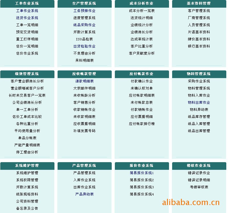 | 专门针对大型印刷企业的特点提出独特的ERP解决方案,在充分利用ERP先进的管理理念的同时,结合国内印刷行业的特点,扩充并延伸了ERP的概念,使其成为真正的印刷企业ERP系统,以帮助印刷企业构建高效、有组织的信息管理平台和体系,为印刷企业管理决策提供及时和科学的依据,从而提高印刷企业在长远发展过程中的整体竞争力,帮助印刷企业走向成功的信息化管理。 包括:工程管理系统、报价管理系统、订单管理系统、生产排程系统、送货作业系统、申采管理系统、仓库管理系统、帐务管理系统、品质管理系统、设备管理系统等。 | | ◆ 工程管理系统 | | 工程管理是 ERP 系统中基本资料的延伸及完善,工程管理的完善能将生产中的出错率降到最低。松柏 ERP 系统解决了市面上任何印刷管理软体在工程管理方面达到深度与专业度。 BOM表管理,样品管理,刀模、菲林、 PS版、 CTP版管理及打样、制版、制刀指令单的生成、外发,在完善工艺的同时兼顾印前资料的备档,让共刀、共版、改版等工作变得轻松。 | | ◆ 报价管理系统 | | 报价系统是用于产品估价、报价、核价、竞价的系统。通过报价系统,用户可以 同时方便、快速、准确地一次性得出多个产品数量的成本价、行情价、利润价,准确把握盈亏线;同时还可进行明细核价,对价格构成进行分析;可以设定不同地区、不同类别的工价标准(如本公司标准、北京出版社工价标准、云南出版社工价标准等),进行多地区工价对比,做到知己知彼,在印刷竟标中处于有利地位(此功能在对政府、出版社的印件竟标中特别有用)。 | | ◆ 订单管理系统 | | 订单是企业与客户连接的桥梁,是企业存在的支柱。订单管理系统是 ERP 系统流程的源头,动态掌握已接订单的进展与完成情况;对新订单,系统及时提供 产品即时库存量、在产量、在单量、交期预警等 讯息。工单作业系统,订单成交经相关人员审单后系统根据以外产品生产记录自动生成新的生产工单,在减少开单人员 工作量的同时又能有效做到防错、防弊。 新报交成交的订单自动转入订单作业系统,对客户下达的订单进行管理 和 跟踪 (已交货情况、发票开立情况 等 ),对客户单次交易金额 及未收款金额的控制,订单饱和量控制,在保证客户交期的前提下,在源头降低公司风险成本。生产工单自动生成(可自动合版),各用料数、生产车数及放损数系统自动计算(多片接生产时能分别计算),生产请领单自动生成,有效防错防弊,解决以往传统手工开单时经常算错纸张数或领错材料等通病。 | | ◆ 生产排程系统 | | 生产排程是 ERP 系统生产管理的核心部分,但现印刷企业普遍存在的单量大交期短、客户临时改单情况多等情况, PMC仅靠传统的手工排单难以适应生产的需要。我司集合数千家印刷企业及十五年印刷管理软体发展经验,有效解决以下问题: 1 .交期: 交期准确是企业在市场竞争中的“利器”之一,松柏生产排程系统将订单交期作为首要排单条件(即交期短的优先生产),对不同交期段系统辅以不同灯号醒示。 2 .机台: 生产工单开立后,系统自动分析不同生产工单不同机台,对各机台所需生产的工单自动排程 3 .预估工时: 系统自动预估每笔生产工单的工时,根据每台机器的排程预估工时自动切班(白班生产量、晚班生产量) 4 .调机: 原定的机台不能如期开工 需要临时改 派机台 怎么办?某些机台特忙 而某些机台特闲,负荷分配 不平衡怎么办?一些单量大,交货急,靠一台机生产赶不上进度要求又怎么办?开盟生产计划为您 解决这些困扰,它可以通过设定互换机台,自动作机台调整和负荷平衡处理,还具备“斩单”功能,将大单分解到多台机上生产。 5 .插单: 现印刷生产中,客户临时改交期改单的现象特别多,所以“插单”在印刷生产过程中也是很普遍的现象。 ERP 系统提供便捷的插单功能,同时插单后,系统能根据调整状况重新自动计算工时,自动切班 6 .预警: 系统能根据每台机器的标准工时与生产的 预估工时自动预警,能对急单、逾期单、重排单等辅以不同的灯号加以警示,能让管理人员一目了然 | | ◆ 送货作业系统 | | ERP 系统的送货作业,完全遵循松柏系统“一单到底”的管理精髓(以订单自动生成送货单,有库存方能送货,送货产生应收帐款),同时根据印刷企业的产品特性,依先进先出的 管理理念生成仓库的出库单。送货明细表、未送清明细表、出货产品分类等报表即时列印。 | | ◆ 申采管理系统 | | 申采管理是企业材料控制及资金控制的重要一环,所以必须做到按量申购、限量申购、计划采购、比价采购、交期控制与供应商稽核相结合。保证生产所需的同时有效降低公司成本,加速资金运转,为企业在激烈 的市场竞争中抢占先机。 松柏 ERP系统之申采管理系统结合制造企业的生产特性,特别是印刷企业的特性,为企业的采购作业提供有效的管理。 1 .申购作业: 申购作业以工单为依据,根据生产需求量、即时库存量、采购在途量,系统自动计算需购量,有效除低库存成本 2 .采购作业: 采购作业以申购为计算采购量,以工单生产交期定义采购交期,系统根据历史单价建议最优单价,有效除低采购成本 3 .采购未到料查询: 根据采购入库询息,系统自动反映已到及状况,采购进度了解提供及时有效的讯息 4 .供应商稽核: 系统对供应商历次的延期交货、品质不良等情况自动记录且相应扣