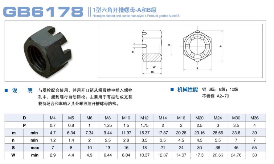 GB6178六角开槽螺母和GB6181六角开槽薄螺母为我司主营产品之一,开槽部分可一次成型。·规格范围:M5-M36·执行标准:GB6178-1986&GB6181-1986/客户标准·等级范围:4级、5级、6级、8级、10级、12级·表面处理:本色、发黑、镀锌等·材料:低碳钢、中碳钢和合金钢