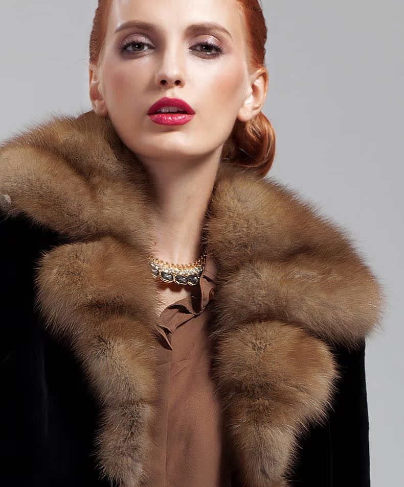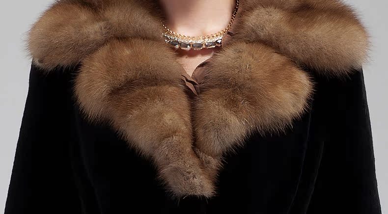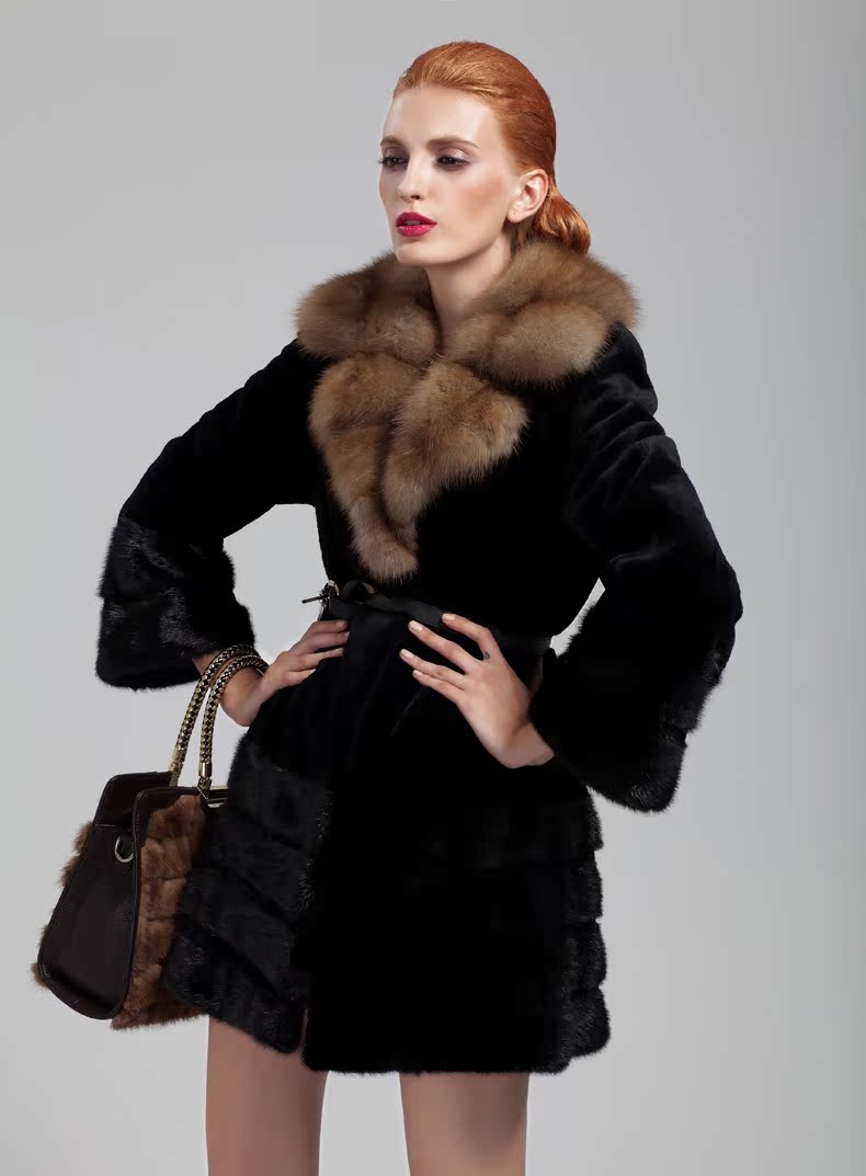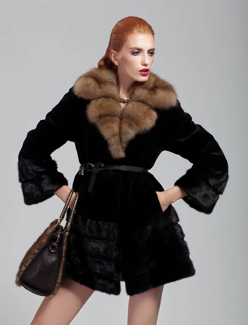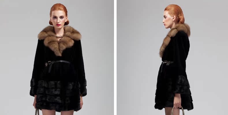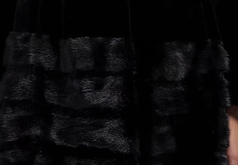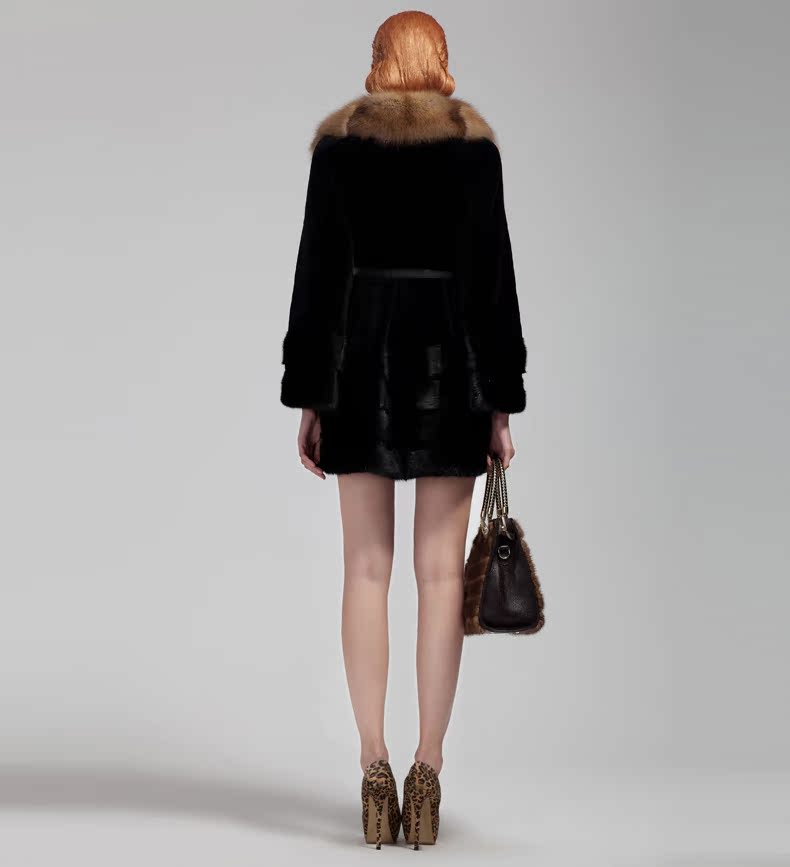 西装领设计增加了貂皮大衣的外形,采用紫貂更是一直那个升华,感觉更气质,也是时尚的一种表现,上身的貂绒,颜色黑的深沉,而下摆的水貂又带有光感,这种绒面和光面的结合又带给这件貂皮大衣更大牌的外形