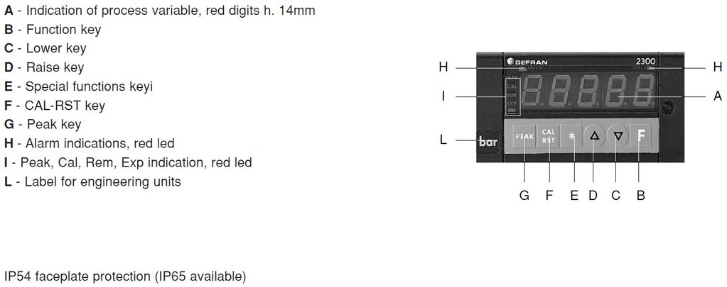GEFRAN【2300】高性能压力显示报警表。测量精度0.2%FSO,采用时间仅2毫秒。是您高端机械的首选。GEFRAN 2300压力显示报警仪表尺寸为48x48mm,面板可组态输入/输出。仪表面板保护等级可达IP65,有效防止的意外损坏。GEFRAN 2300压力显示报警仪表主要应用于、压力检测、远程中继器、测试台、食品加工设备等。GEFRAN 2300型压力显示报警表可面板组态输入/输出方便快捷,压力继电器控制输出,自带密码保护功能,可防止意外组成错误引起麻烦。并且GEFRAN 2300压力显示报警表可选数字R232/485通讯,并且可远程组态。GEFRAN 2300仪表自带24VDC电压,方便各类变送器供电输入,40B48支持模拟再变松输出电压/电流可组态。(电压:0~10、2~10、0~5、1~5;电流:0~20mA、4~20mA)等。