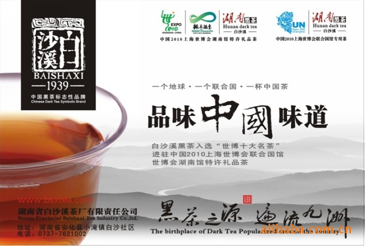 湖南省白沙溪茶厂有限责任公司,其前身为湖南省白沙溪茶厂(国有),沿革承接于1939年,至今已有71年历史,是我国紧压茶的发祥地,创造了黑茶史上的多个第一,即第一片黑砖茶,第一片茯砖茶和第一片花砖茶。品牌荣誉: 2006 年, 白沙溪茶厂生产的千两茶荣获第三届国际茶业博览会金奖 2007年, 白沙溪茶厂生产的精品黑砖茶荣获第四届国际茶业博览会金奖. 2008年, 白沙溪茶厂生产的天茯茶荣获第五届国际茶业博览会金奖. 2009年, 白沙溪茶厂生产的5301芽尖荣获第六届国际茶业博览会金奖. 2009年,白沙溪品牌上榜被誉为中国茶业奥斯卡奖的“金芽奖”,被授予“中国黑茶标志性品牌”称号。 2009年末,白沙溪黑茶被推选进驻“2010年上海世博会”联合国馆与湖南馆,被誉为“一个地球、一个联合国、一杯中国茶”。 2009年末,白沙溪商标被评为“湖南省著名商标”,同时被授予“湖南名牌”称号. 2010年4月,白沙溪黑茶成为“2010年上海世博会”湖南馆唯一特许礼品茶 |
